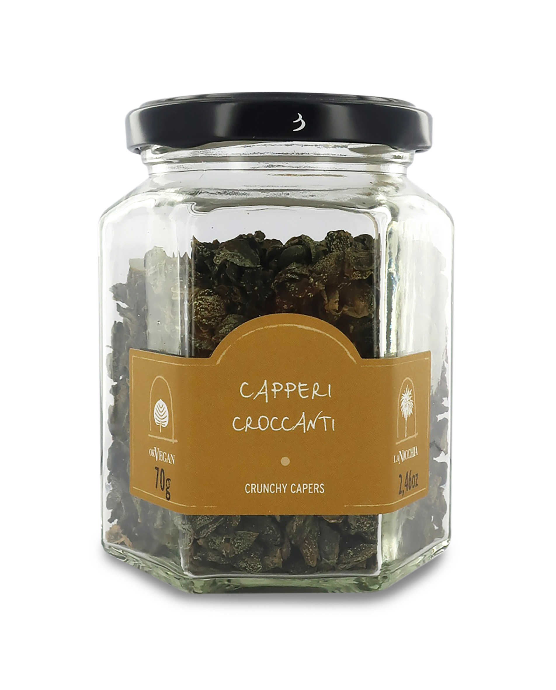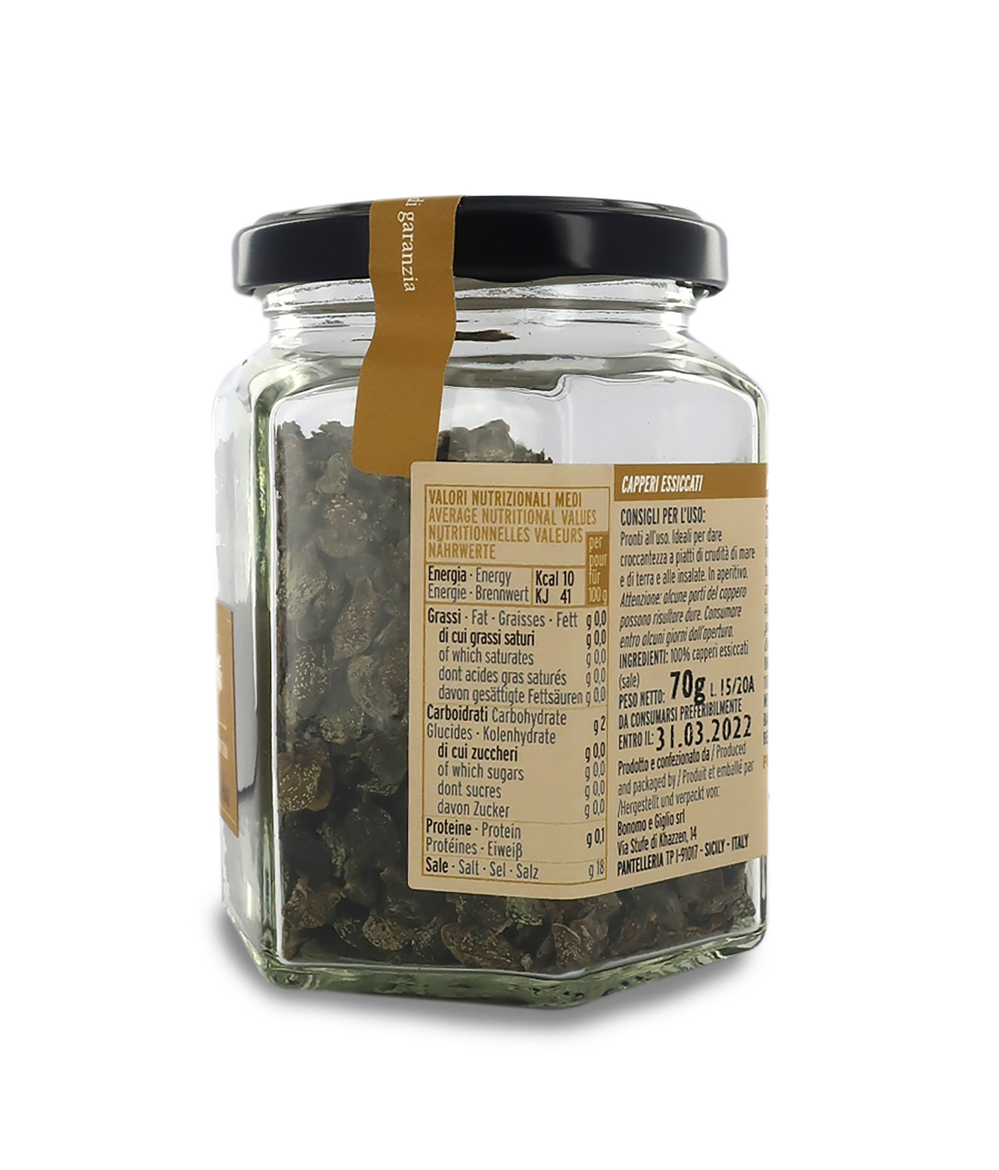 Rivisitazione del cappero a opera de La Nicchia, che propone il celeberrimo simbolo pantesco essiccato, in una forma tanto inusuale quanto sfiziosa. Vengono rigorosamente selezionati capperi del medesimo calibro, in modo da ottenere un prodotto omogeneo e uniforme. I capperi vengono dissalati ed essiccati, prima al sole e poi in disidratatore, per diventare l'ingrediente naturale perfetto che dona ai vostri piatti una nota croccante molto particolare. Perfetti anche da sgranocchiare durante un aperitivo, o come guarnizione di piatti di pesce, carne o pasta.