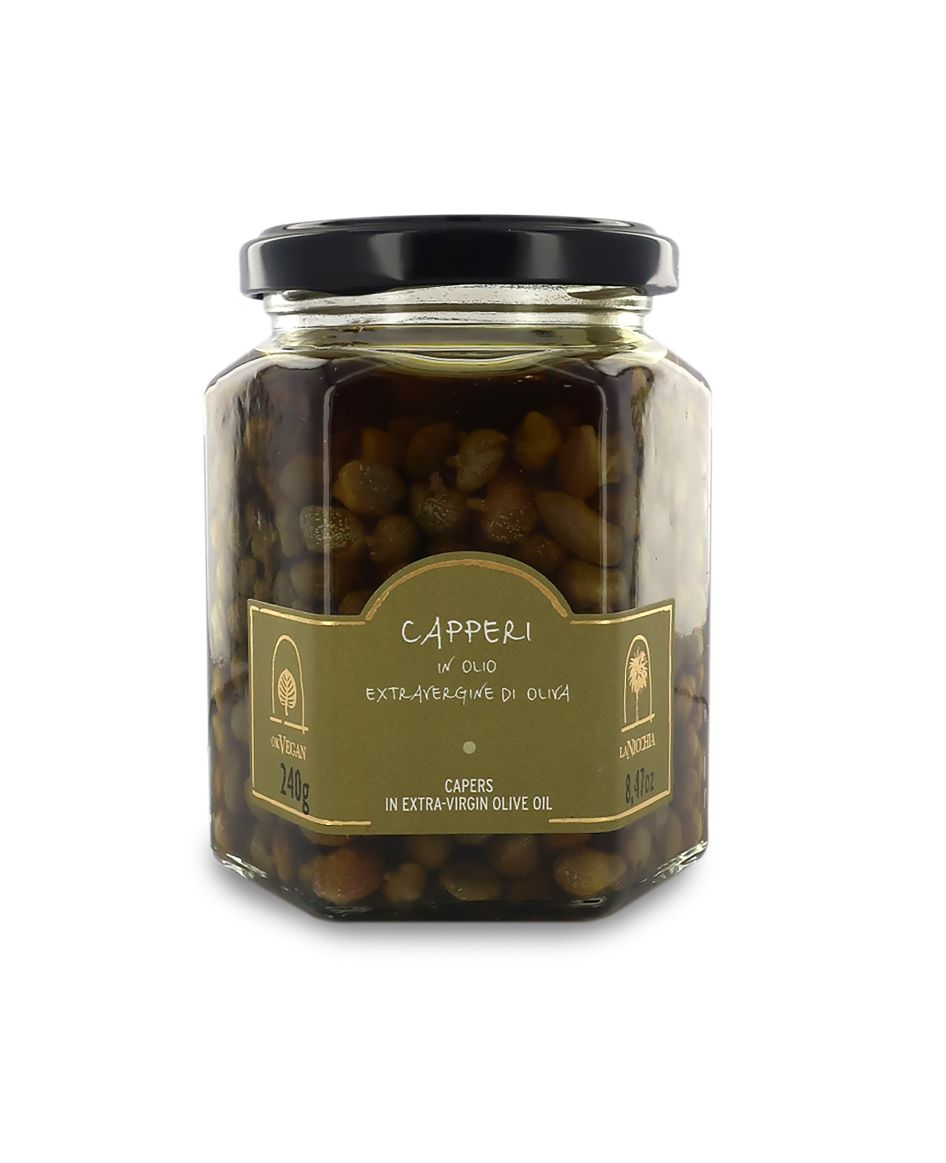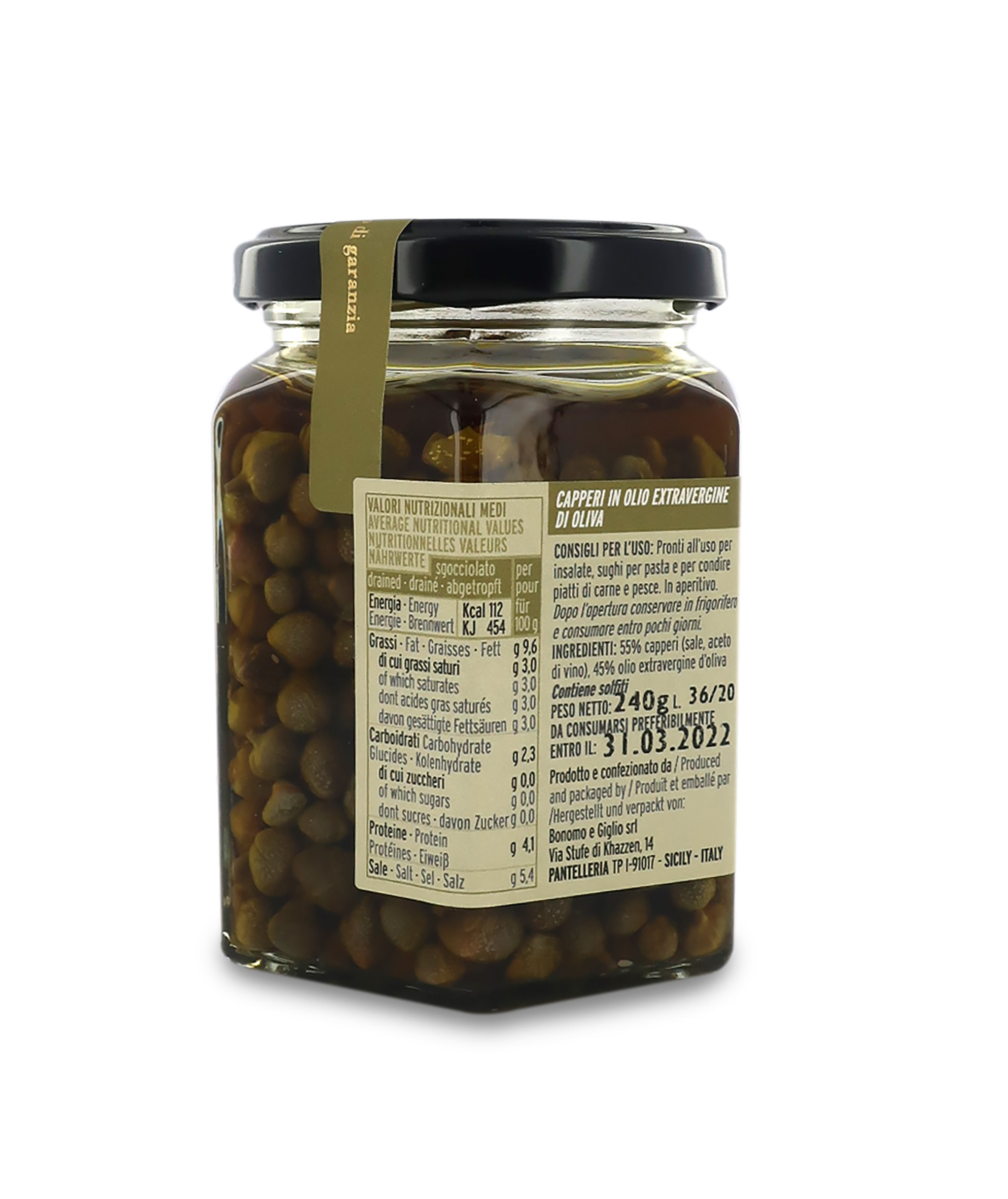 Capperi di Pantelleria, piccolo calibro, già pronti all’uso, conservati in olio extravergine d'oliva. La loro ridotta dimensione consente ai capperi di mantenere una consistenza croccante. Ideali per insalate di riso e per condire pesce arrosto o alla griglia. Ottimi anche durante gli aperitivi, magari su un crostino di pane o cracker.