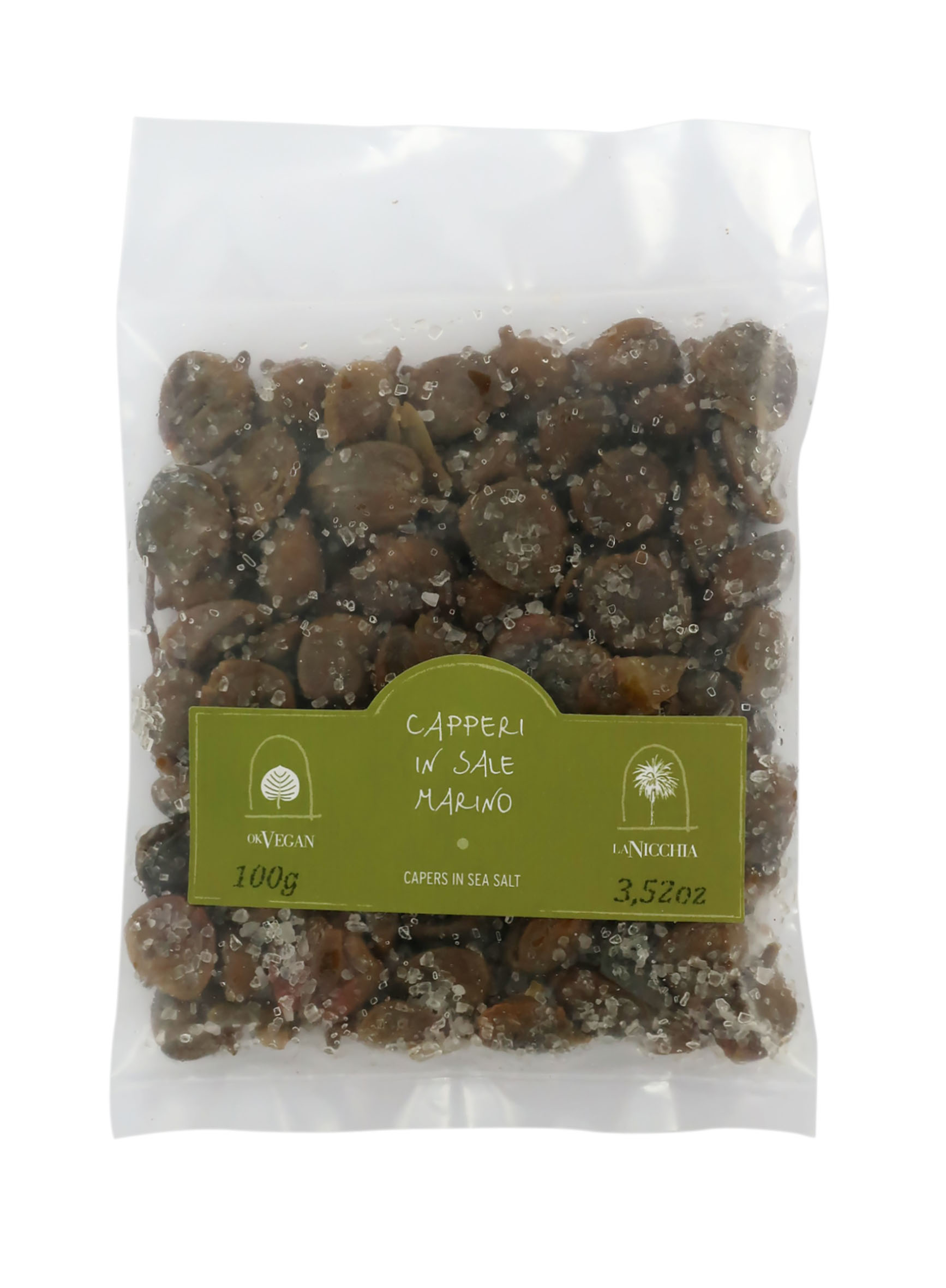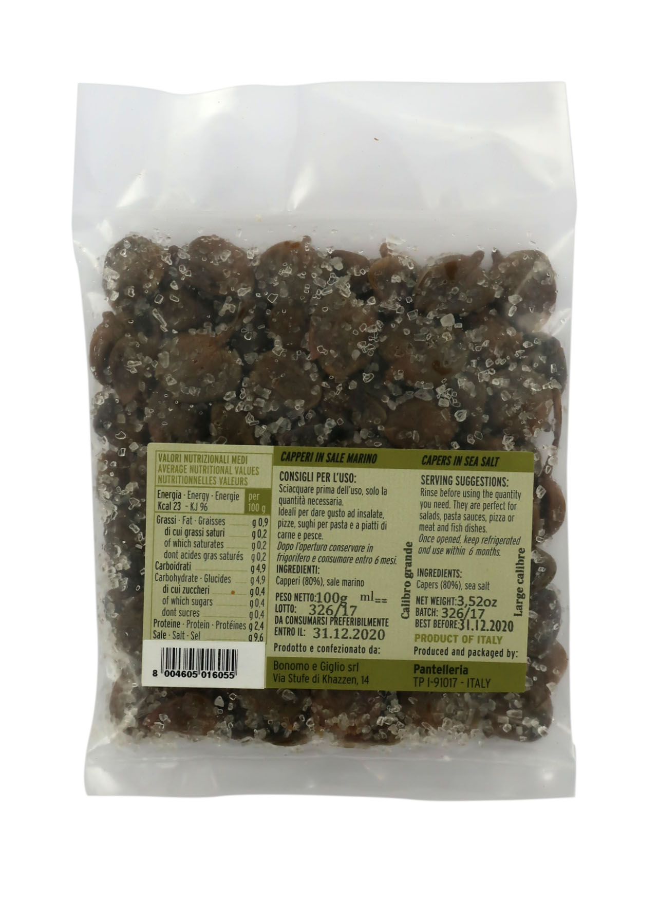 Capperi selezionati, calibro grande, conservati in sale marino. I capperi grandi sono indicati per condire sughi di pomodoro o per realizzare creme e patè. Sciacquarli dal sale prima dell’uso.