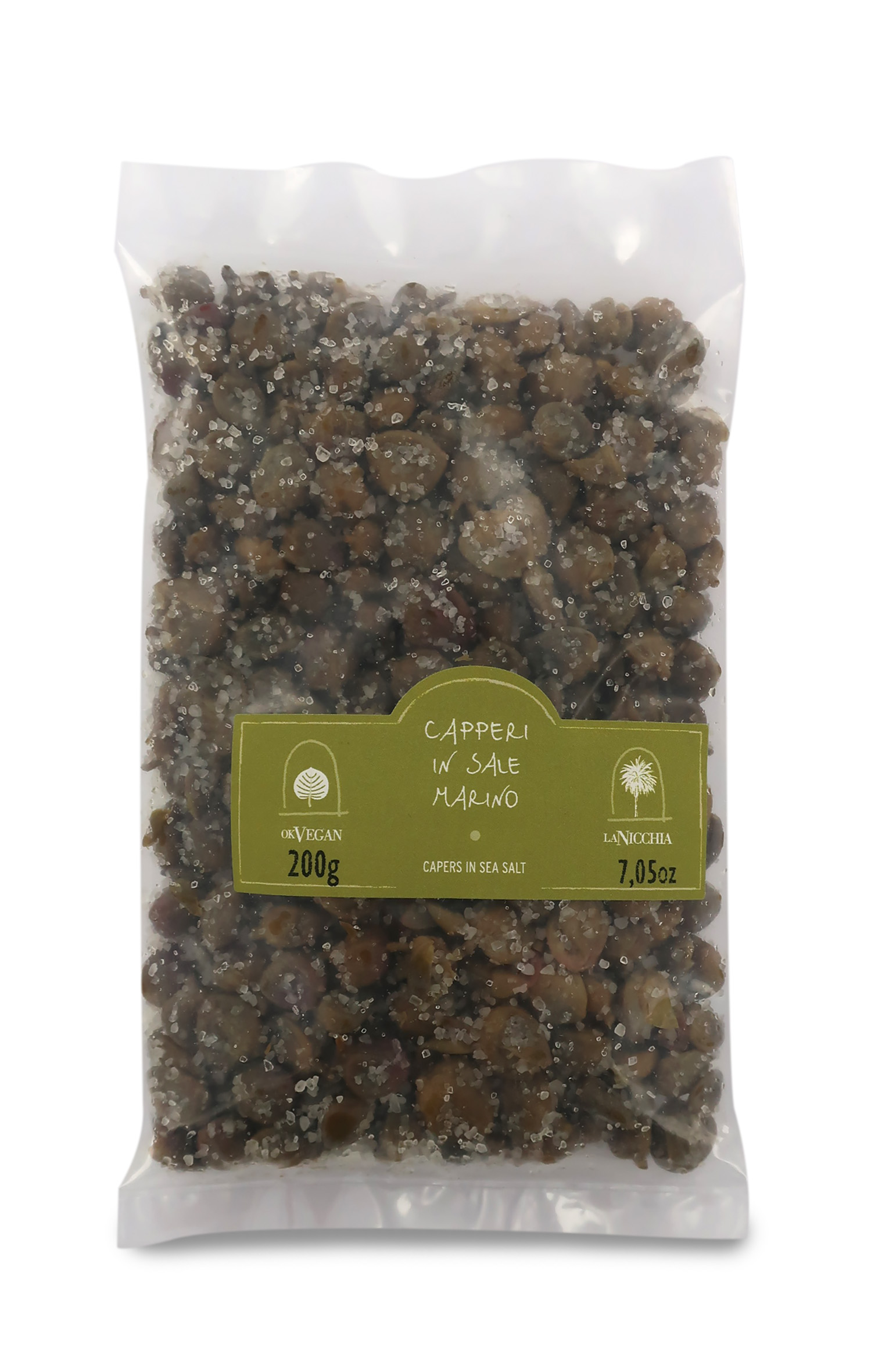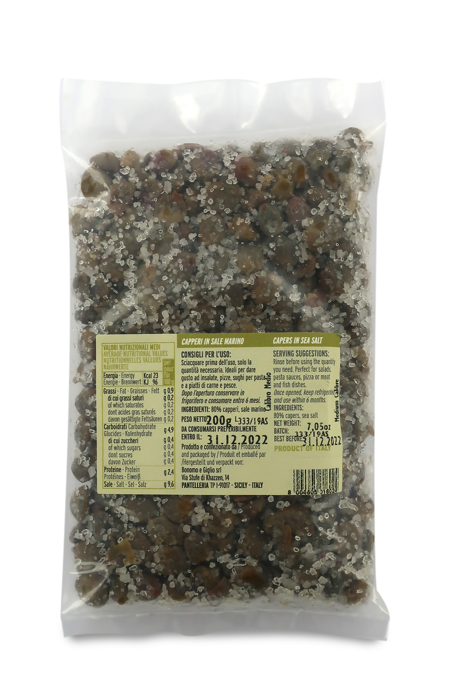Capperi selezionati, calibro grande, conservati in sale marino. I capperi grandi sono indicati per condire sughi di pomodoro o per realizzare creme e patè. Sciacquarli dal sale prima dell’uso.
