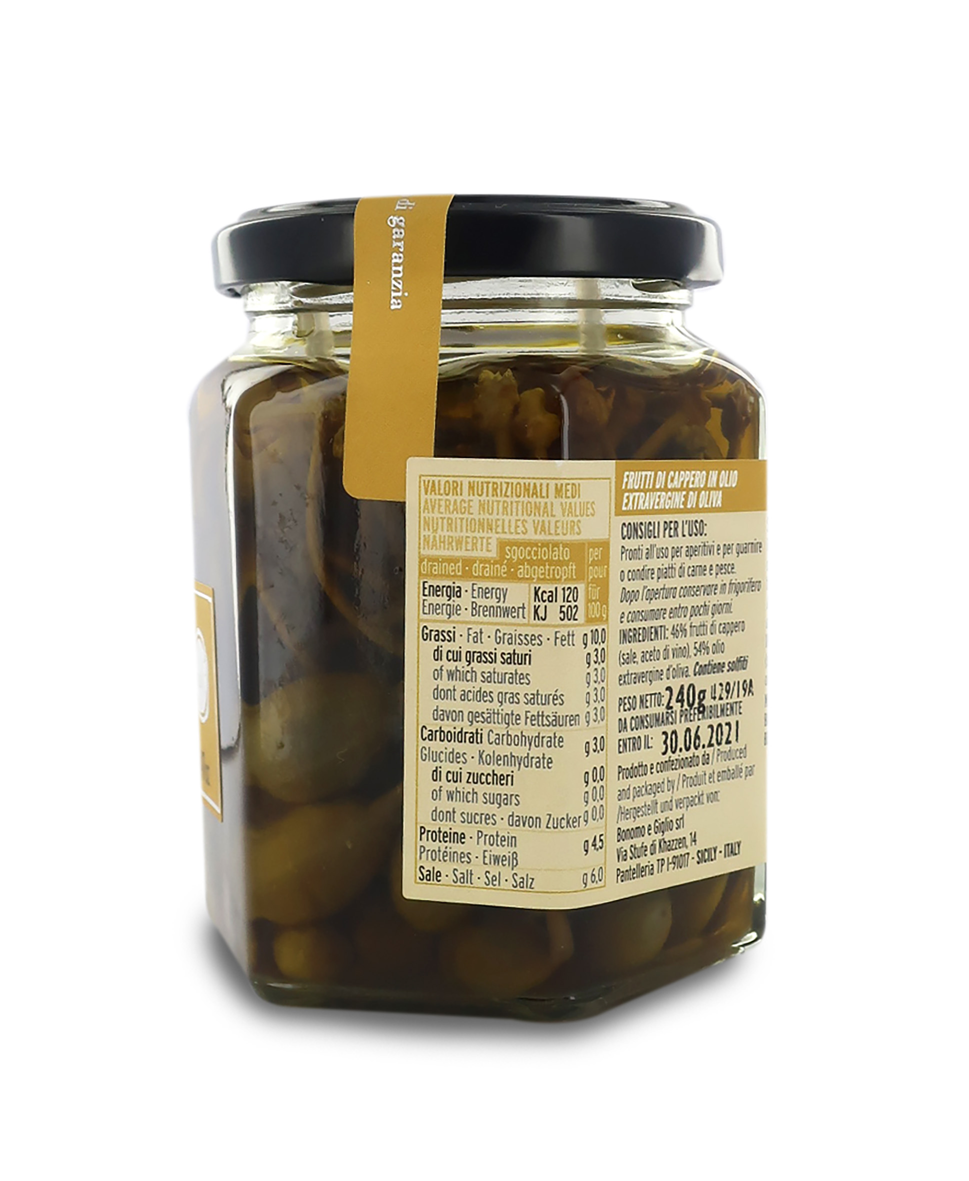 Ingredienti: 54% olio extravergine d’oliva, 46% frutti di cappero (sale, aceto di vino). Allergeni: contiene solfiti.
