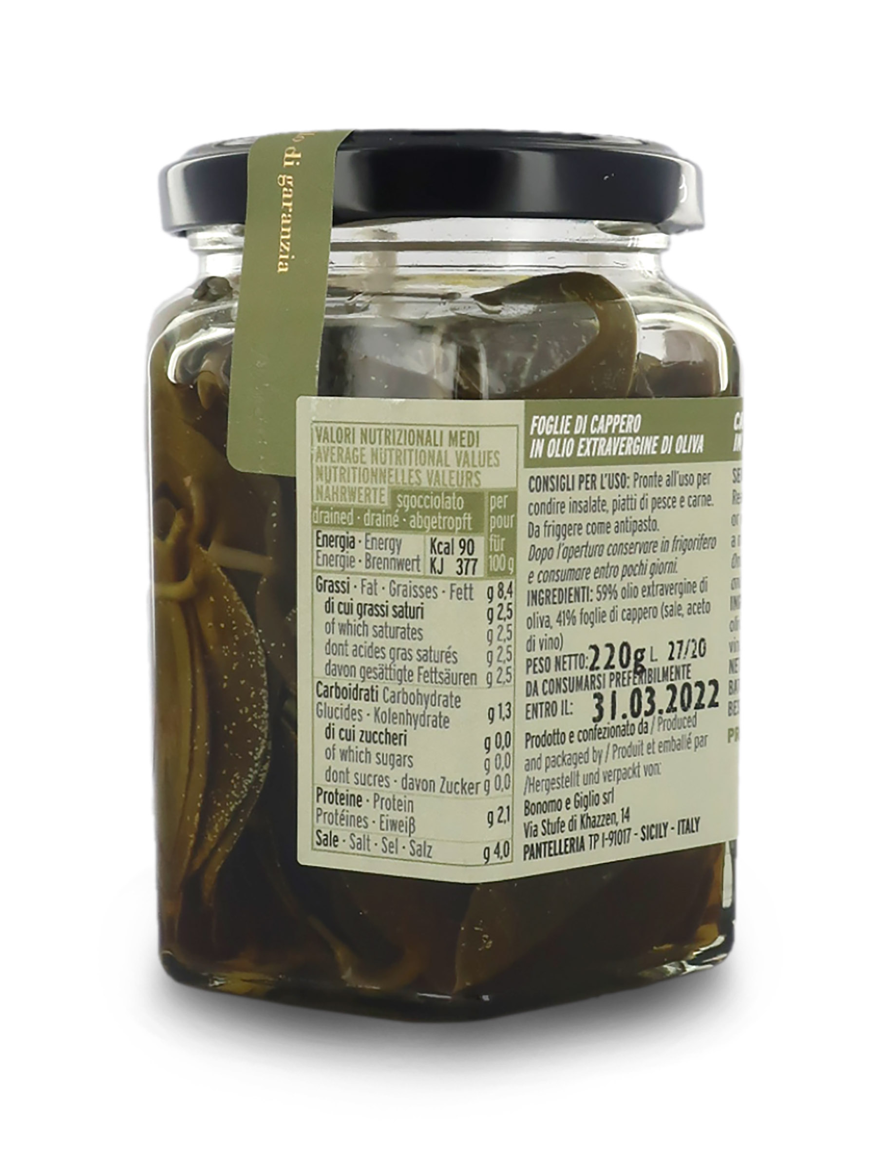Ingredienti: olio extravergine di oliva, 41% foglie di cappero (sale, aceto di vino).