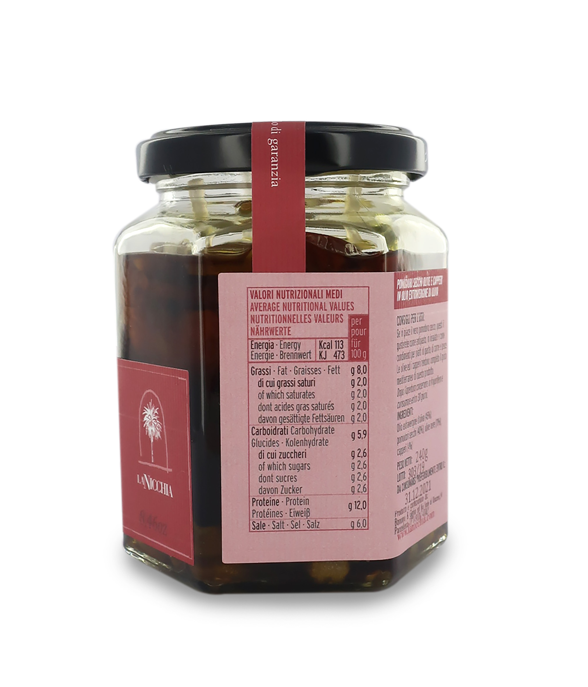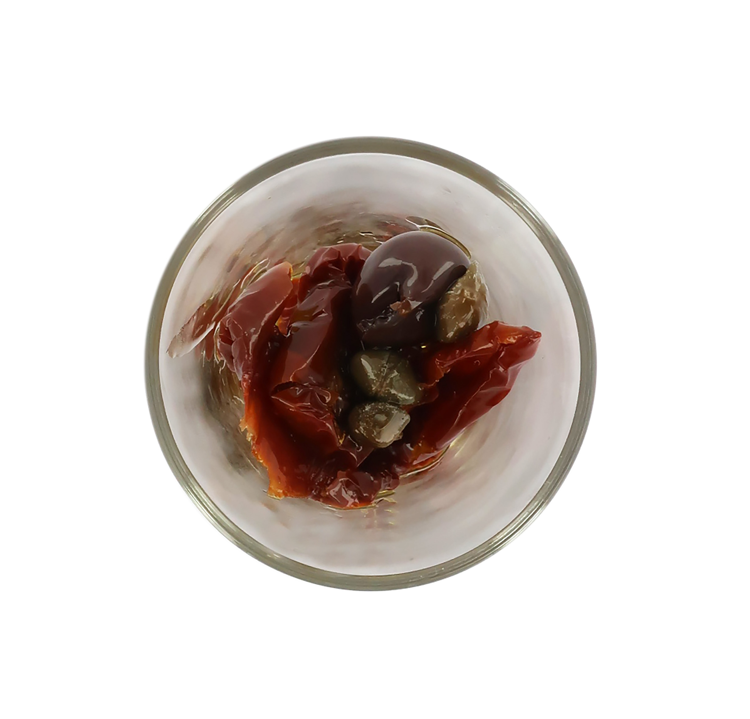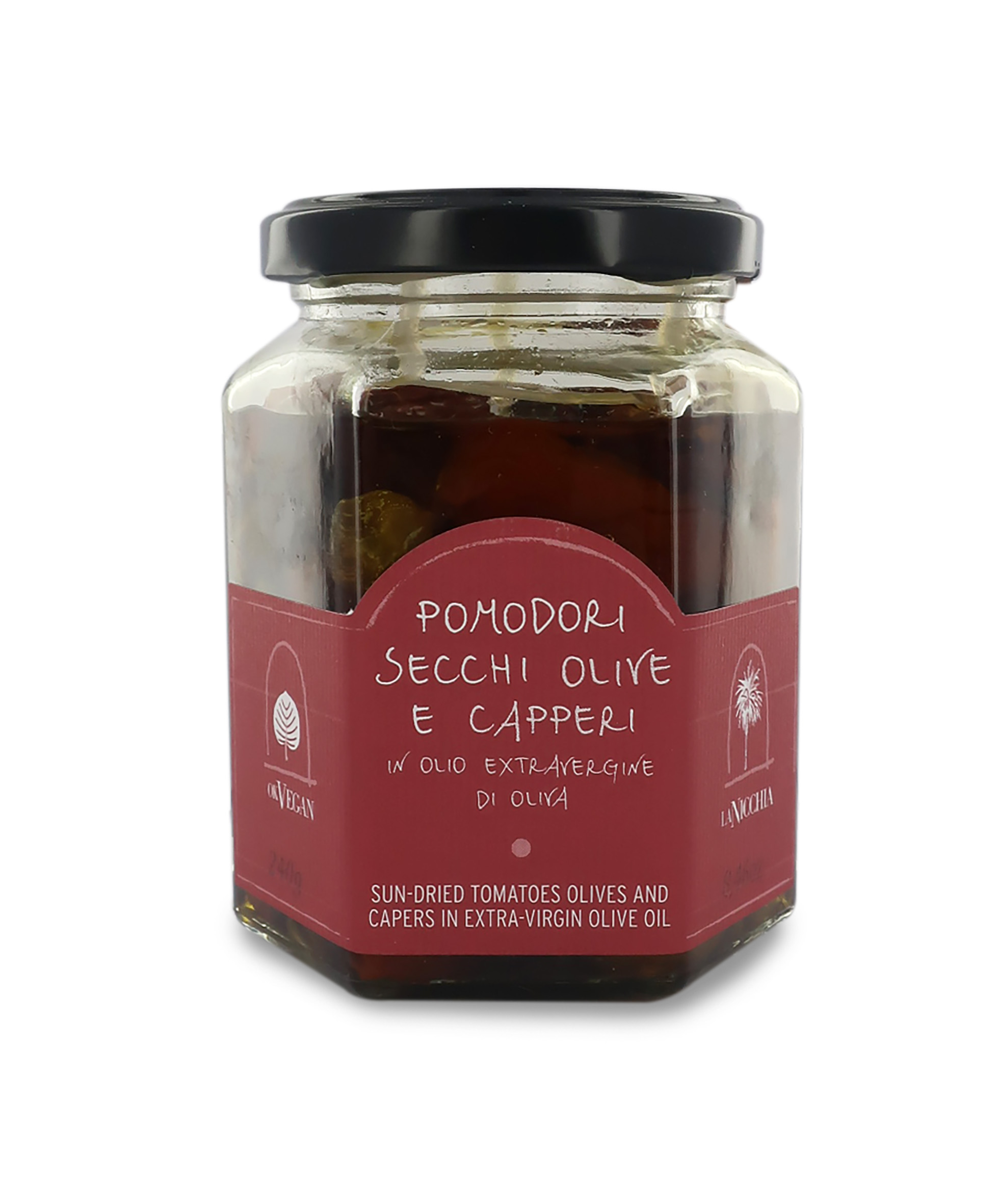 Pomodori essiccati, olive e capperi sottolio, preparati a Pantelleria. I prodotti impiegati per realizzare questo prodotto sono accuratamente scelti in modo che mantengano gusto e consistenza anche sottolio. Sono conservati in olio extravergine d'oliva di qualità. Ottimi per insaporire un'insalata o delle bruschette per l'aperitivo. Perfetti come contorno a carni bianche.