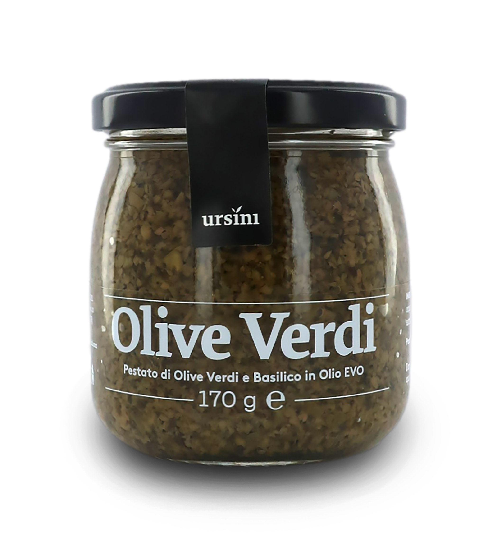 Pestato di olive verdi italiane, piacevolmente insaporito da basilico. Questa preparazione è realizzata con olive denocciolate verdi in salamoia e olio extravergine d'oliva. Si tratta di una versione molto particolare di pâté di olive. Infatti, le olive sono sminuzzate in pezzi leggermente più grandi rispetto al solito, risultando ricche di gusto al palato. In vasetto da 170g. Ottimo da spalmare su tartine e per farcire sandwich gourmet, è indicato anche come condimento per ravvivare una pasta in bianco o come accompagnamento a piatti di carne o pesce.