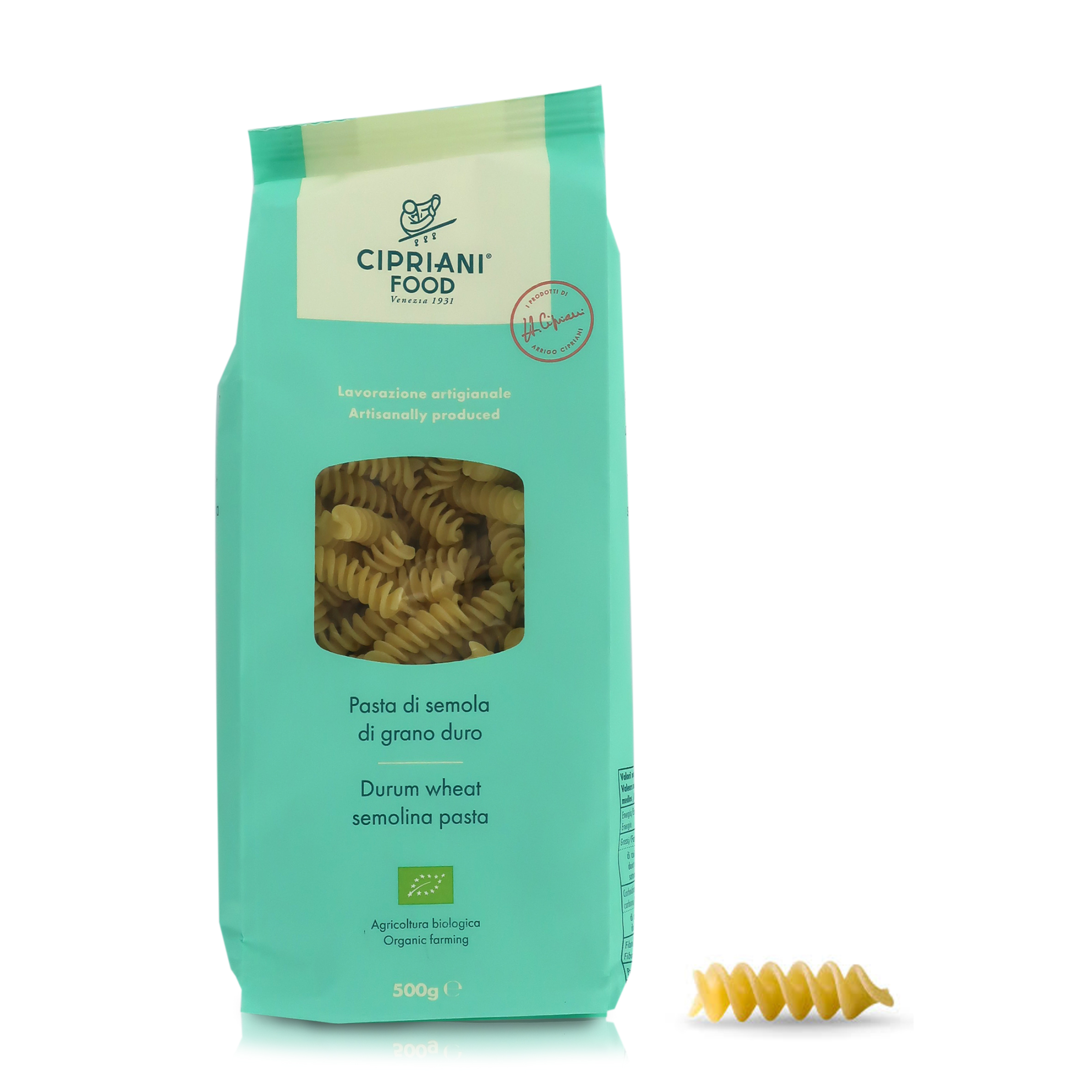 Formato iconico, tipico della pasta italiana. Con la loro splendida forma a spirale, i fusilli Cipriani raccolgono qualsiasi condimento. Cipriani suggerisce di assaggiarli leggermente indietro di cottura, accorciando di un solo minuto il tempo di cottura suggerito in confezione. I fusilli Cipriani tengono bene la cottura e grazie alla trafilatura al bronzo, la superficie risulta porosa al punto giusto per poter trattenere il condimento senza farlo scivolare. Ottimi anche per la realizzazione di insalate di pasta fresche per l'estate.