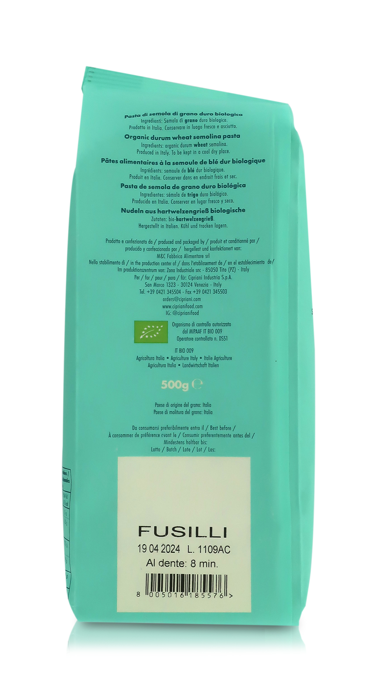 Pasta di semola di grano duro biologico, origine Italia, a lavorazione artigianale, 12 pacchetti da 500 grammi l'uno, per un totale di 6 kg di pasta.