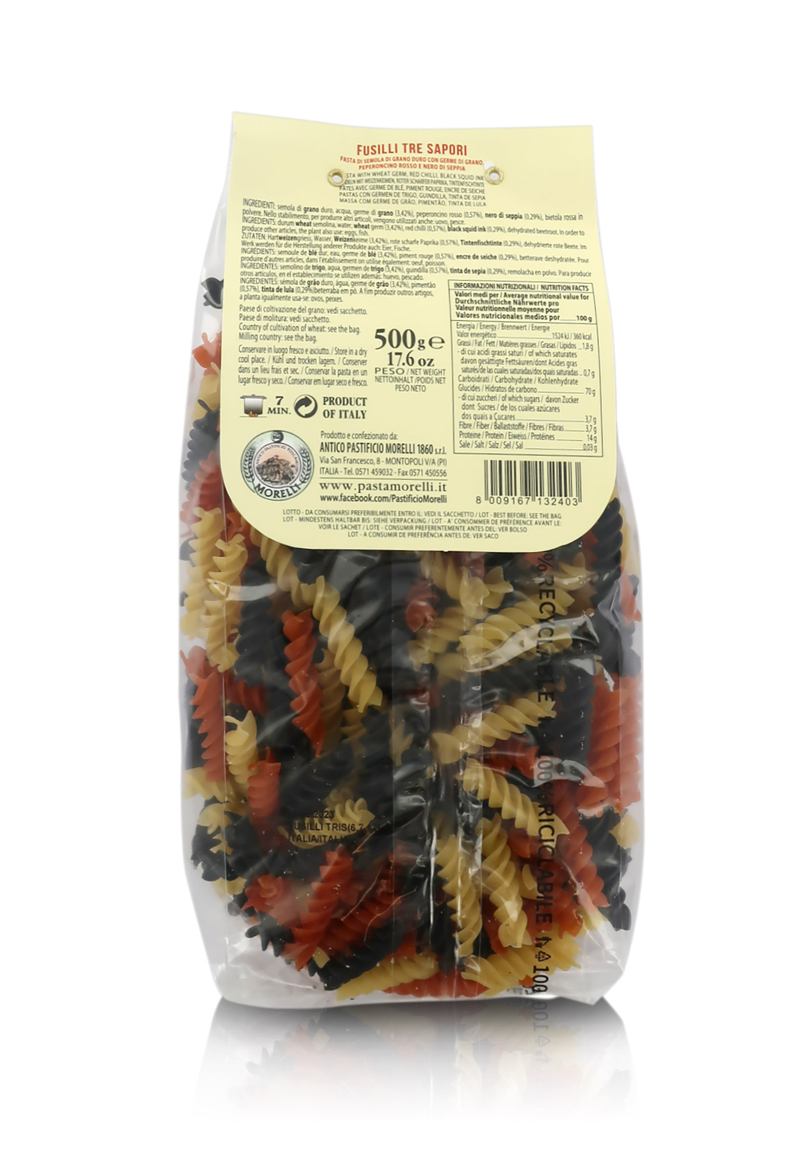 Ingredienti: Semola di grano duro, Acqua, Peperoncino rosso in polvere, Nero di seppia, Bietola rossa in polvere.