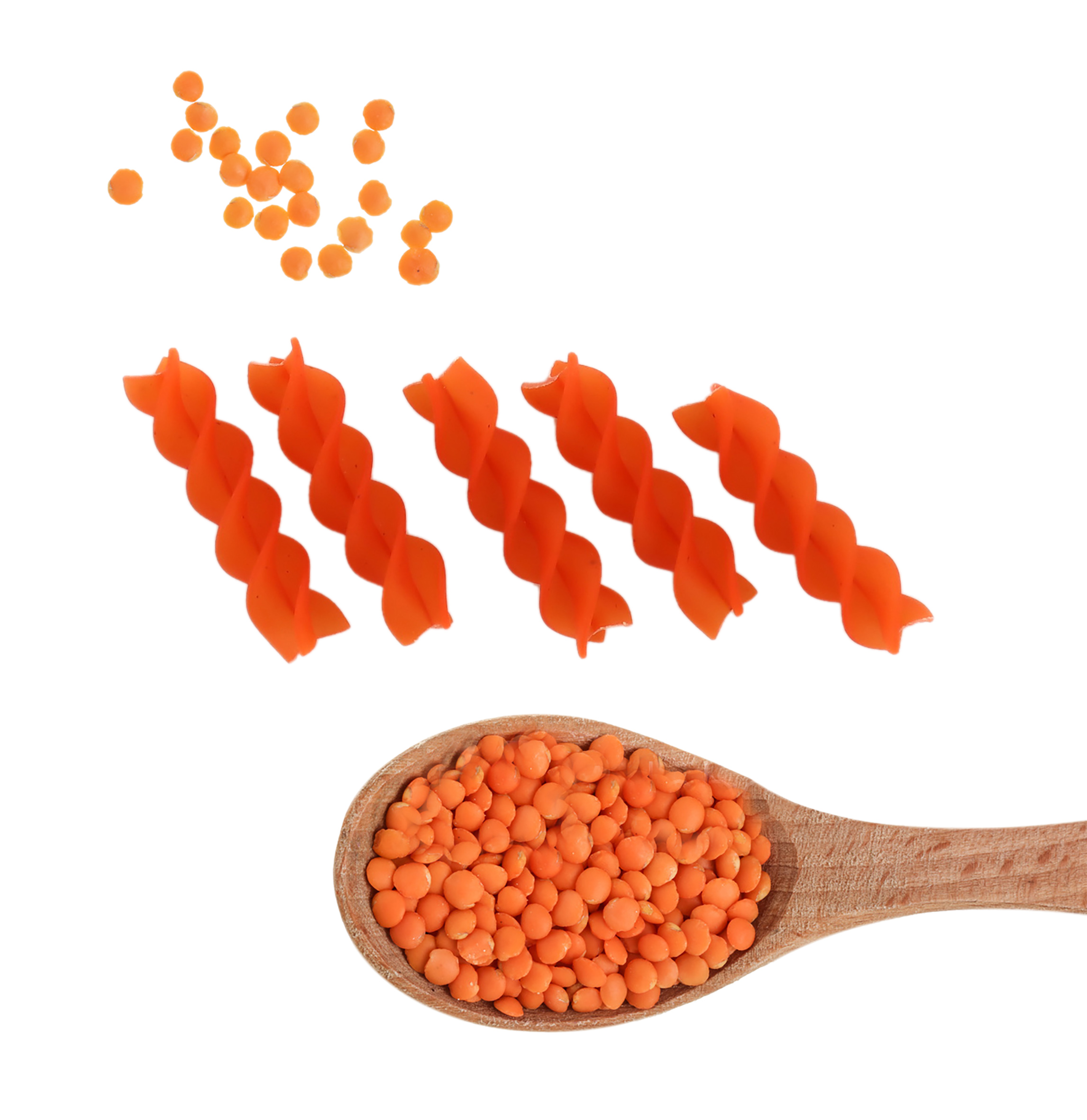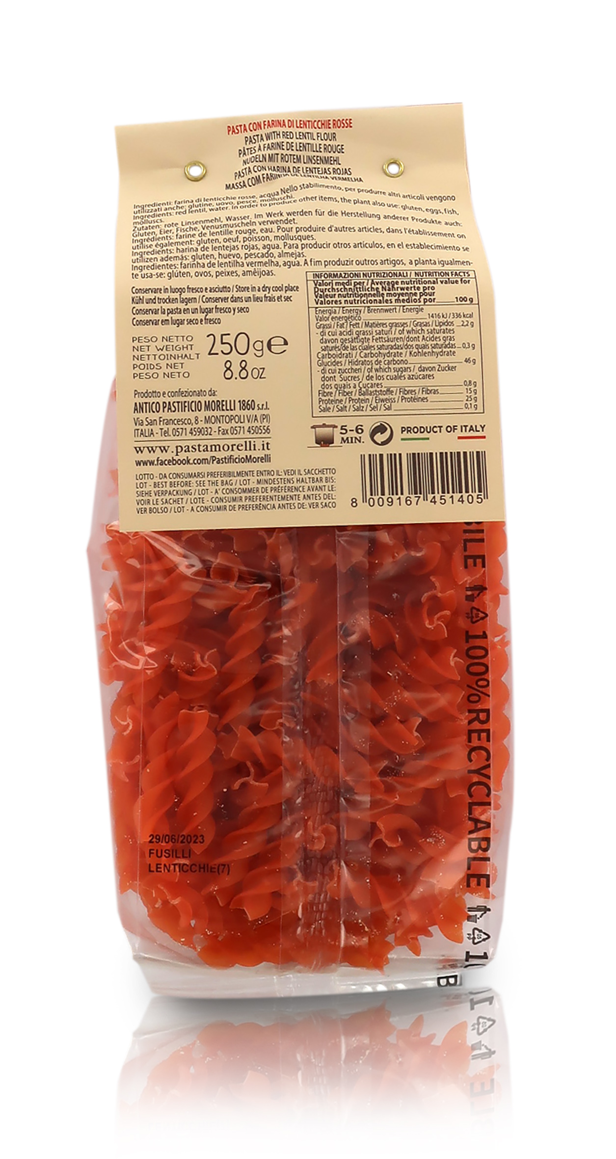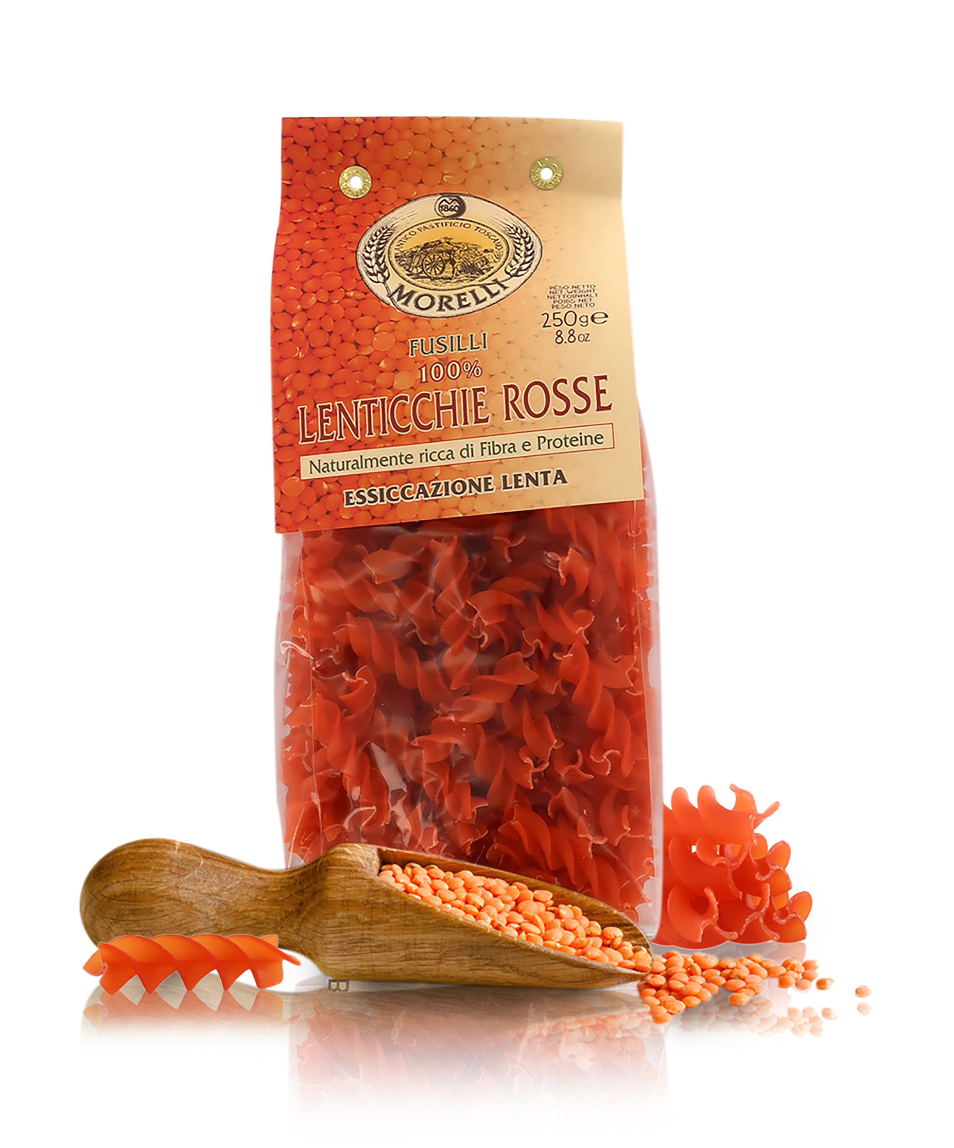Fusilli alle lenticchie rosse, linea "I Legumi 100%", 8 confezioni da 250 grammi. Le paste di questa linea, realizzate con legumi, sono naturalmente ricche di fibra e proteine.