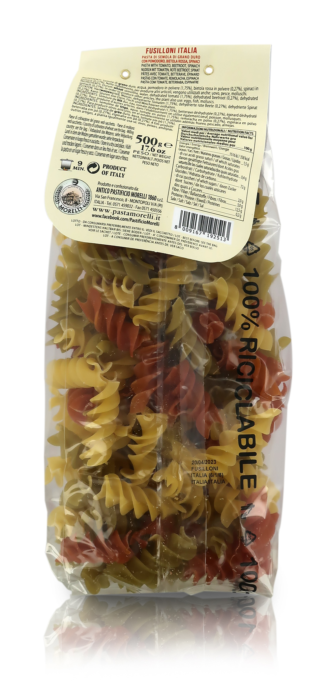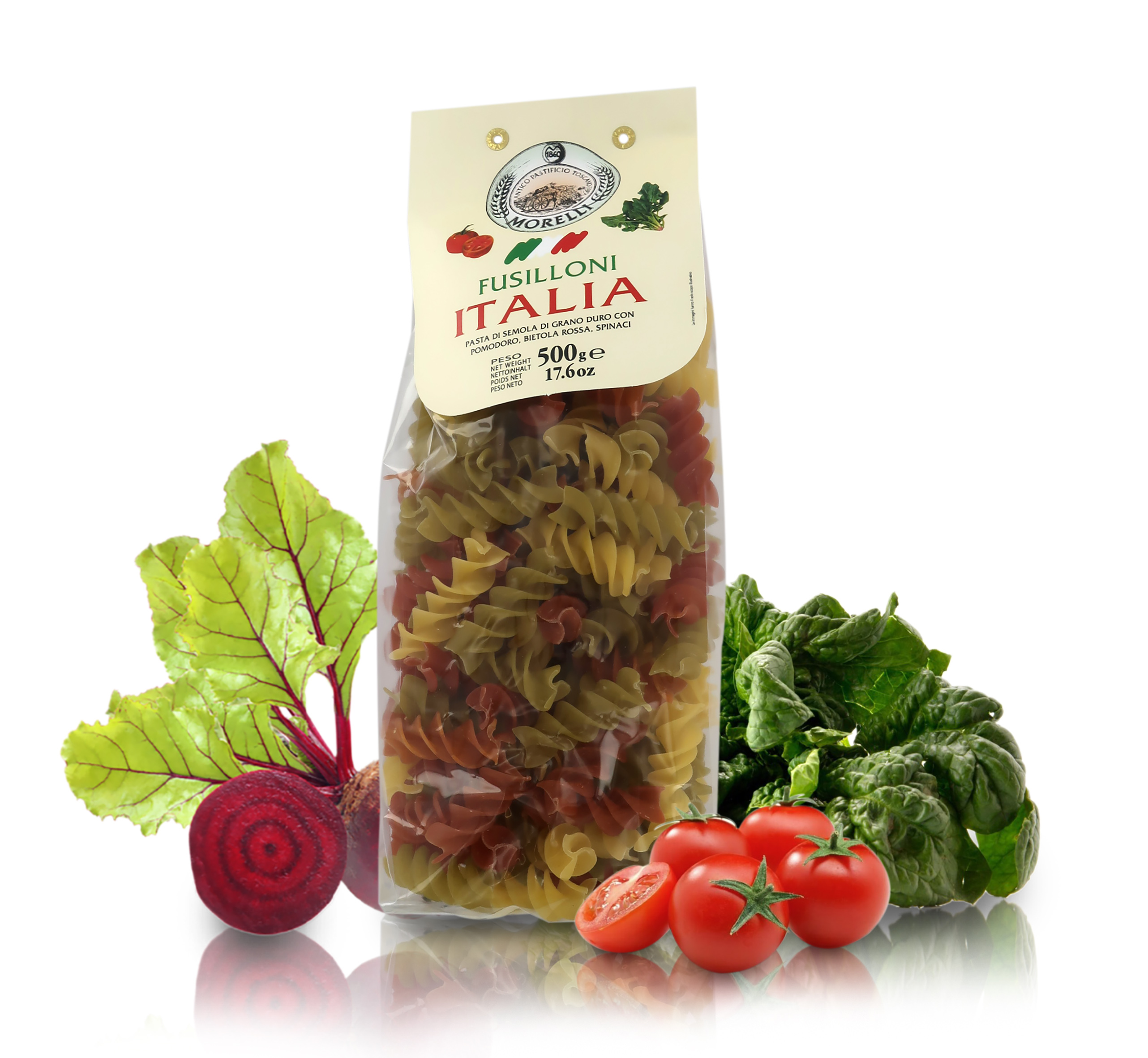 Fusilloni tricolori bianchi, rossi e verdi. Fanno parte della linea "La Pasta Multicolore", che include vari formati di pasta variopinta. La colorazione è del tutto naturale, ottenuta con pigmenti di origine vegetale (es. barbabietola o curcuma) o animale (es. nero di seppia per la pasta nera). In questi fusilloni tricolori, la colorazione neutra della pasta è data dalla semola di grano duro, mentre per la variante verde e rossa Morelli impiega rispettivamente spinaci in polvere e un mix di bietola rossa e pomodoro polverizzati.