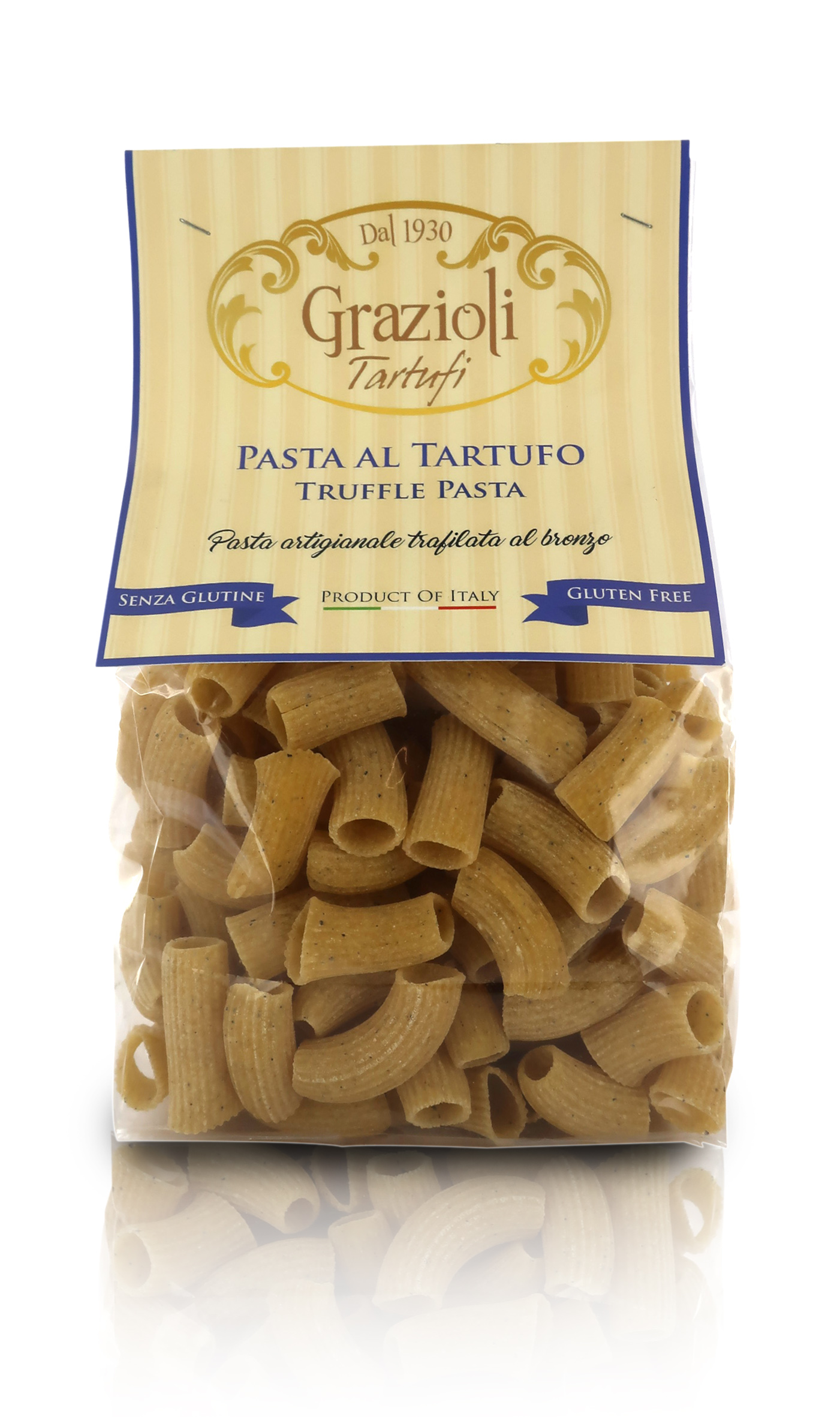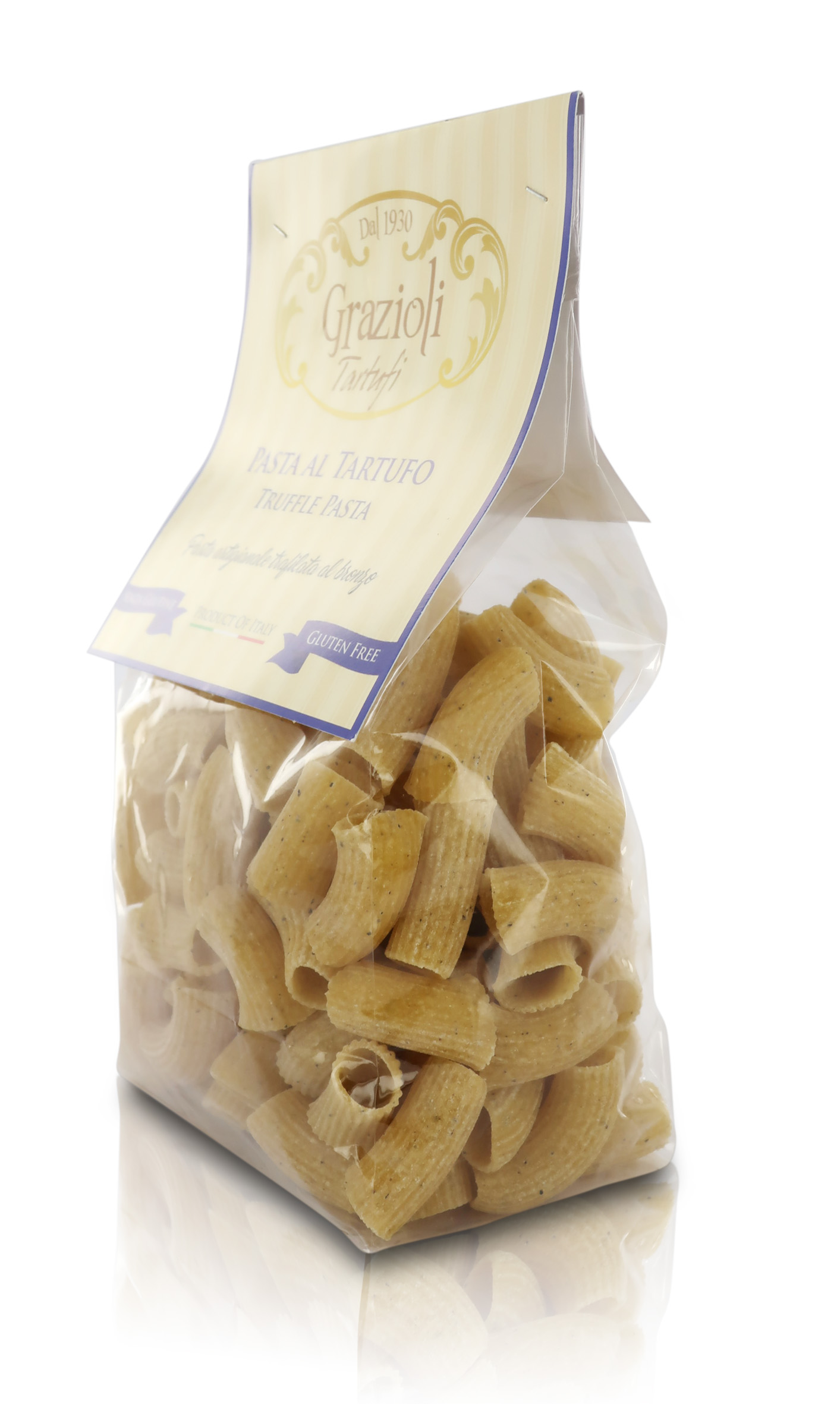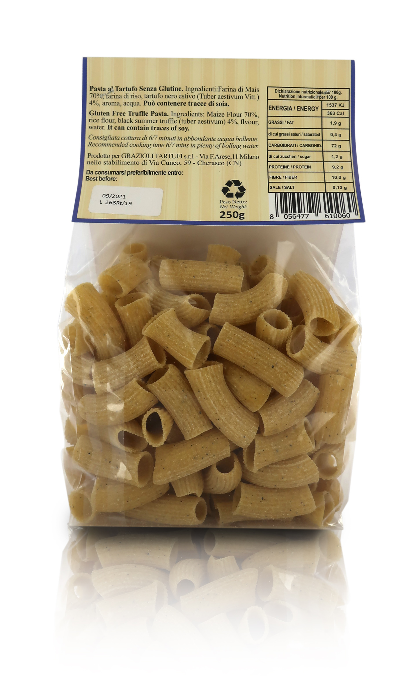Ingredienti: farina di mais 70%, farina di riso, tartufo nero estivo (Tuber Aestivum Vitt) 4%, aroma, acqua. Può contenere tracce di SOIA. Cottura: 6/7 minuti in abbondante acqua bollente.
