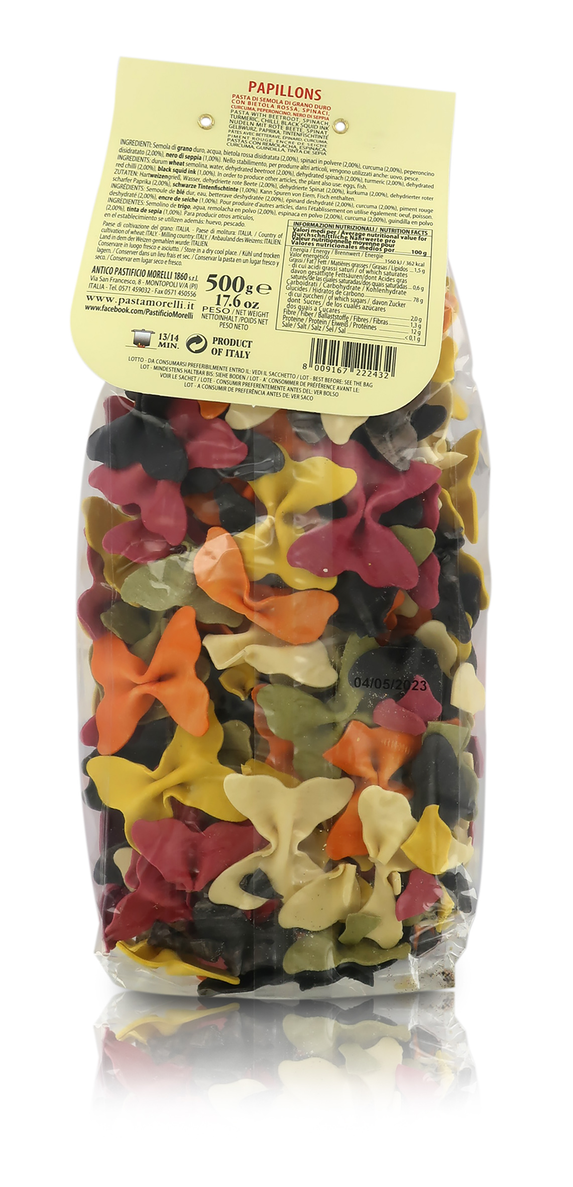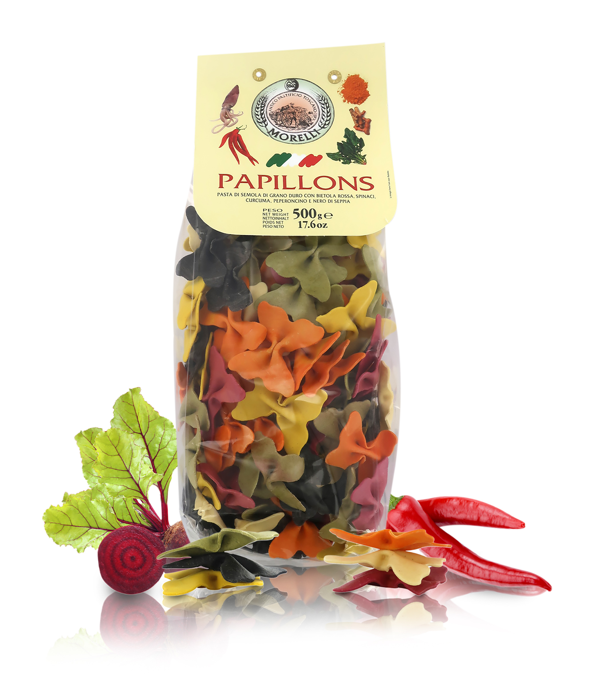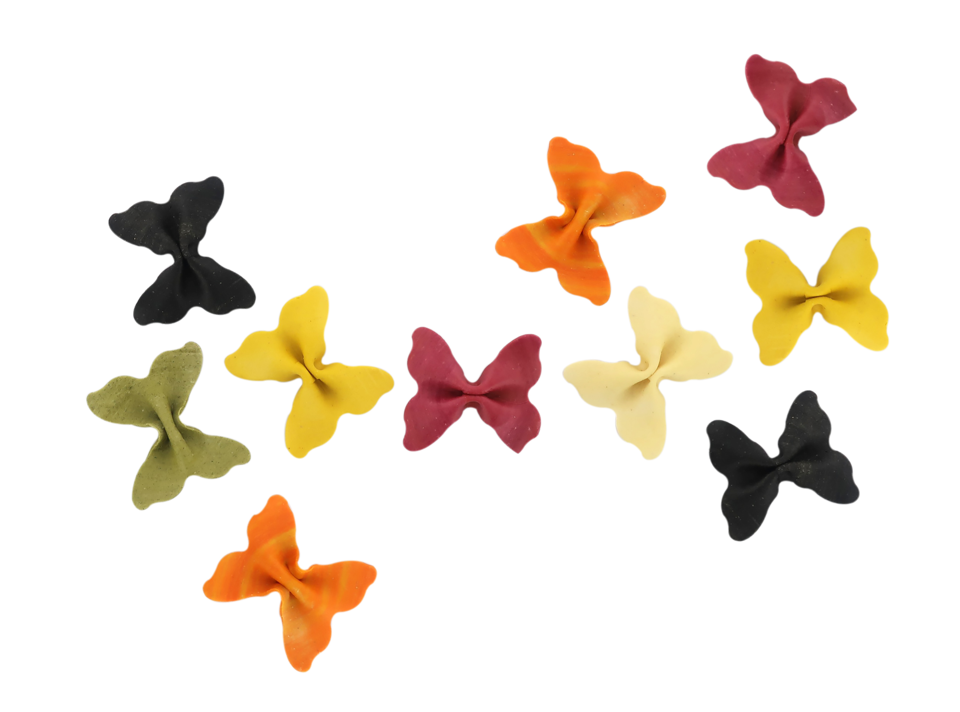 Pasta a forma di farfallino (papillon) ai 6 sapori. Fanno parte della linea "La Pasta Multicolore", che include vari formati di pasta variopinta. La colorazione è del tutto naturale, ottenuta con pigmenti di origine vegetale (es. barbabietola o curcuma) o animale (es. nero di seppia per la pasta nera). In questa pasta colorata a forma di papillon, i colori vengono resi con bietola, spinaci, curcuma, peperoncino e nero di seppia.