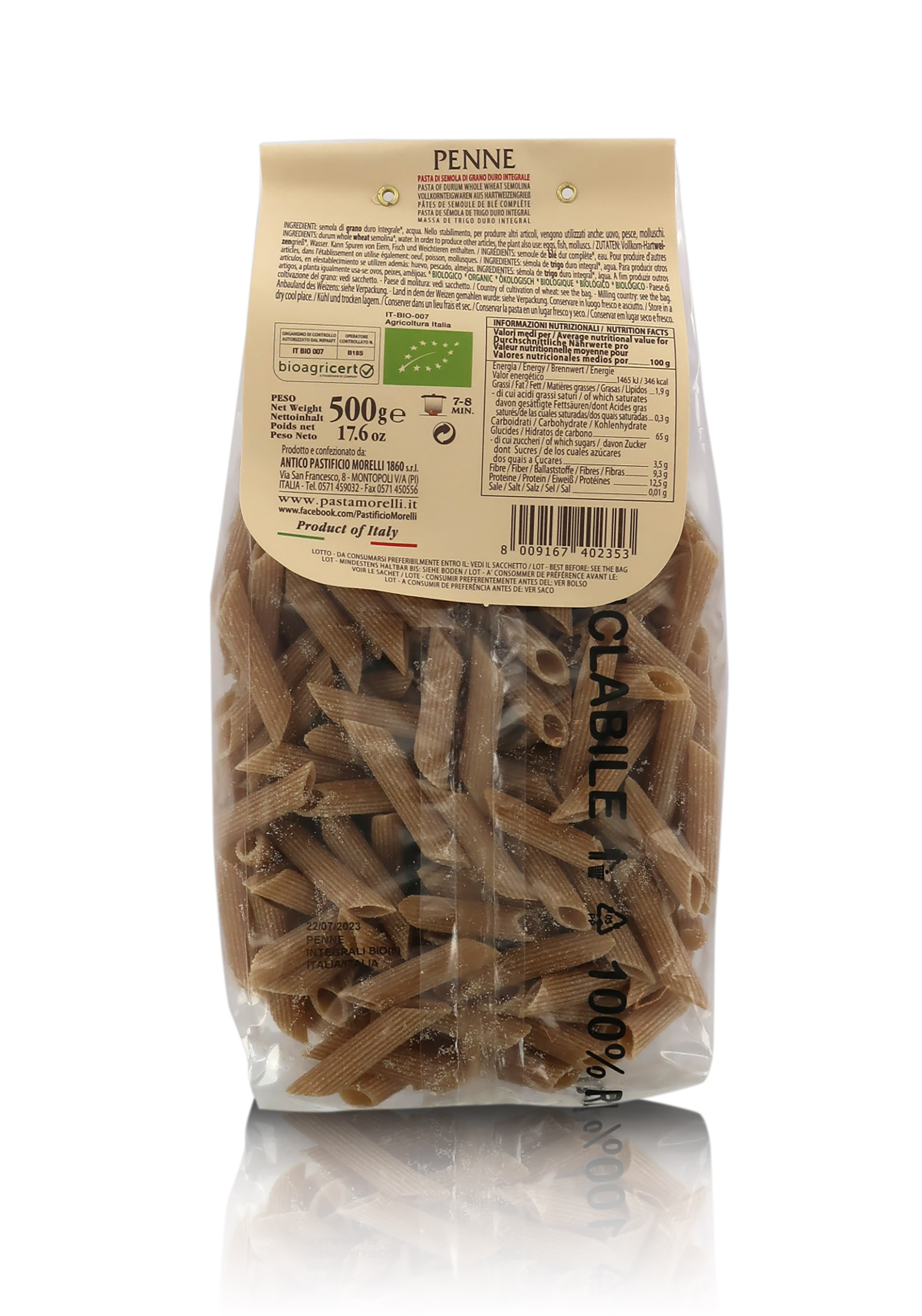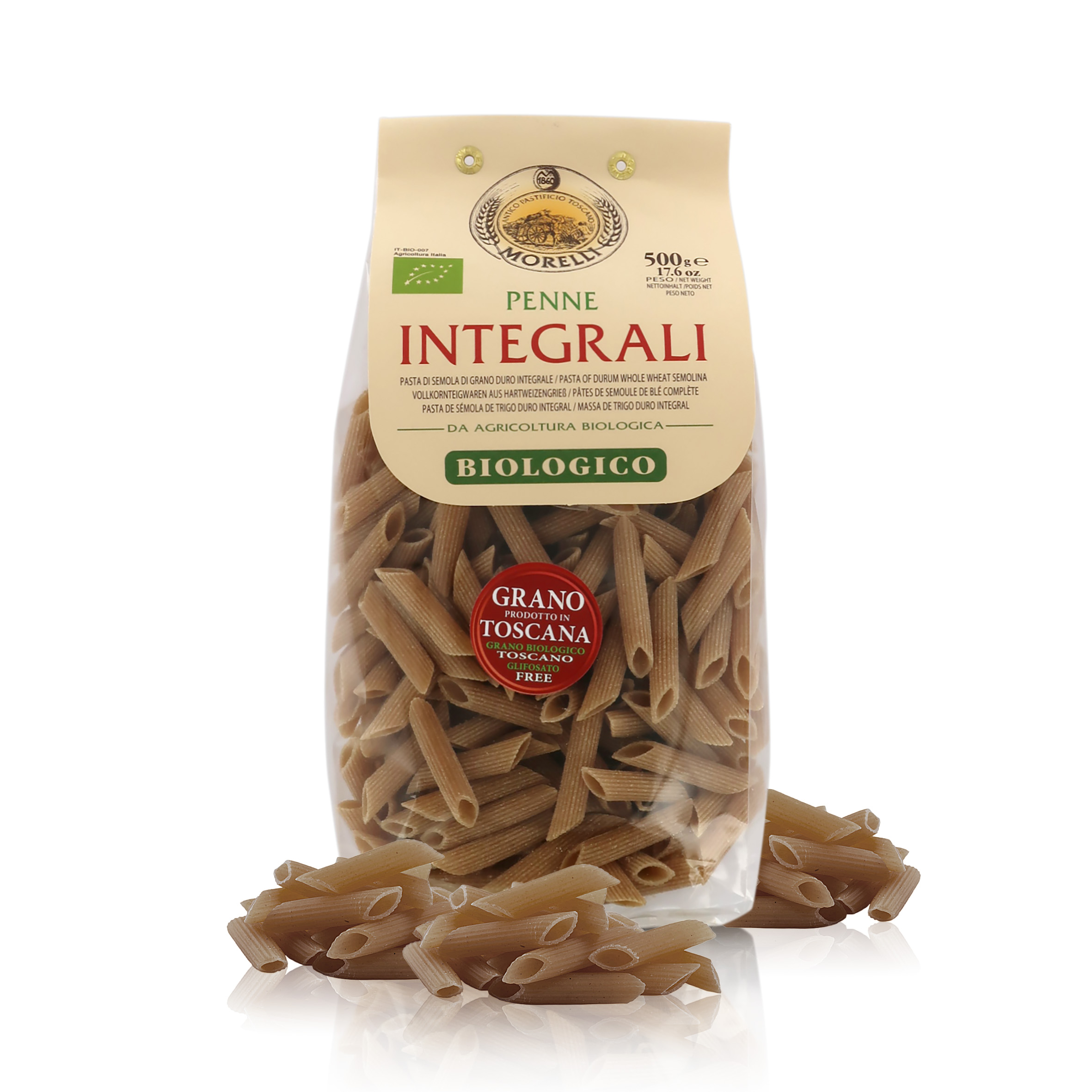 Penne integrali ottenute da grano toscano senza glifosati, 6 confezioni da 500 grammi.