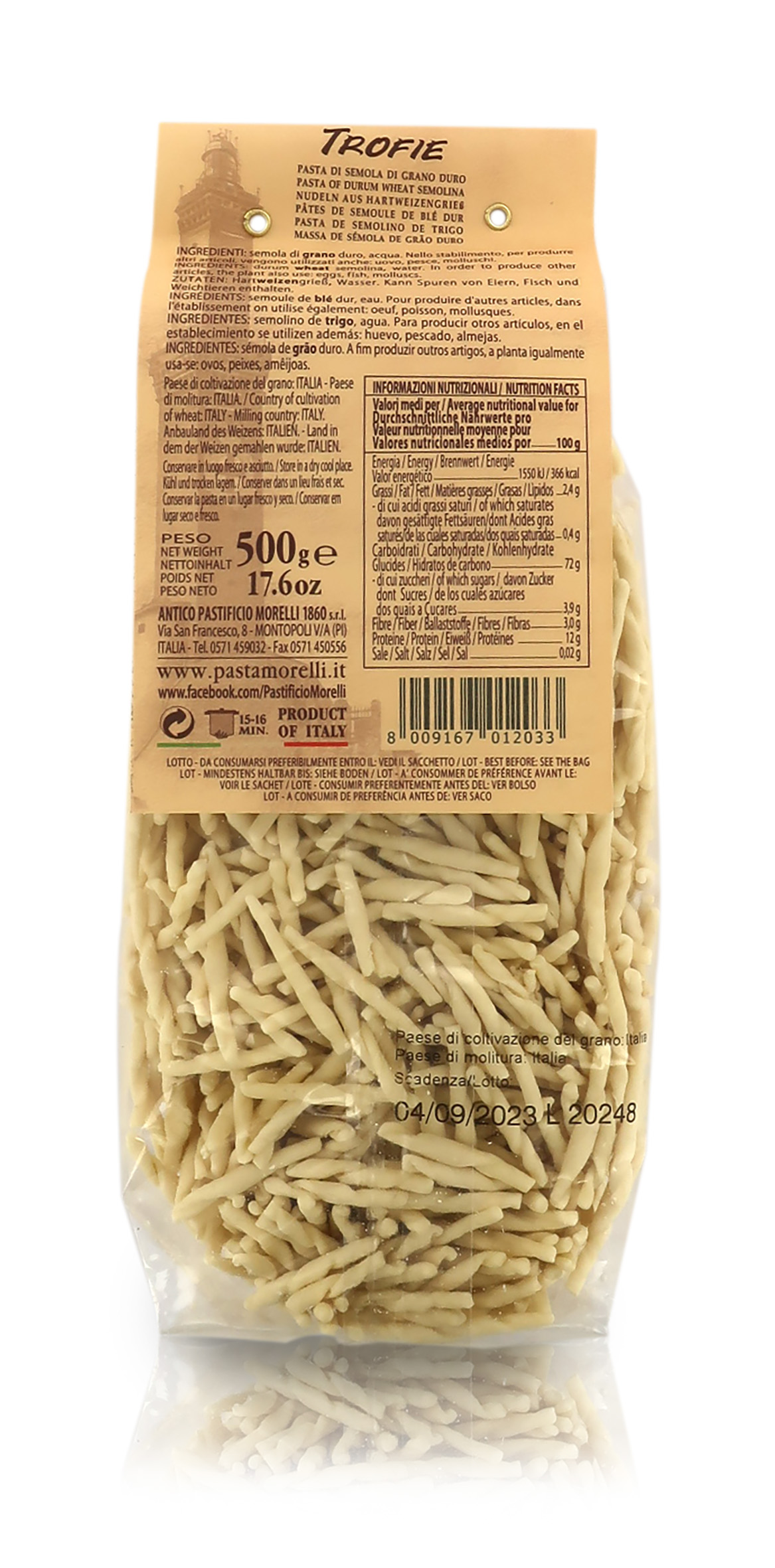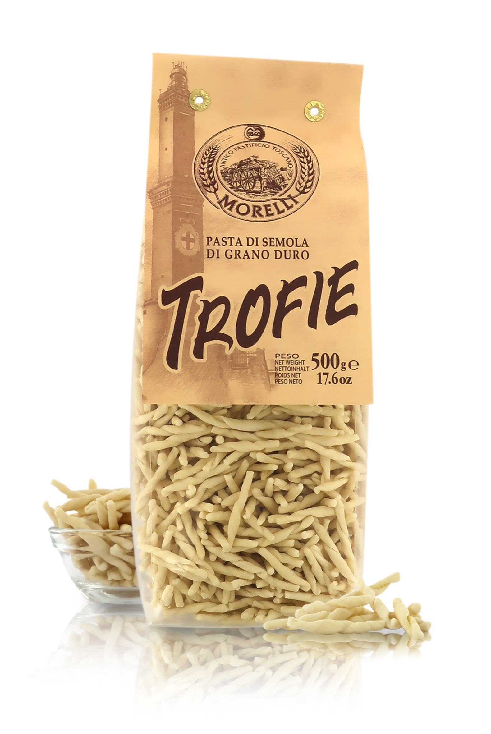 La pasta Morelli è preparata artigianalmente in un pastificio a gestione familiare in provincia di Pisa, fondato nel 1860. Ormai da ben 5 generazioni, la pasta viene preparata usando ottime semole di grano duro e tecniche classiche, che includono trafilatura al bronzo ed essiccatura a basse temperature, nel pieno rispetto della tradizione. Fiore all'occhiello della produzione Morelli è la pasta al germe di grano, che impiega un ingrediente naturale solitamente scartato, che la lavorazione artigianale, invece, consente di reintrodurre nell'impasto, donando alla pasta un gusto e un aroma molto particolari. La gamma di paste Morelli include: pasta al germe di grano, le tipicità regionali, la pasta all'uovo e germe di grano, la pasta integrale di filiera Toscana e integrale Senatore Cappelli, pasta di legumi, pasta senza glutine, grani antichi, farro e kamut, pasta aromatizzata monogusto, multicolore e articoli da regalo.