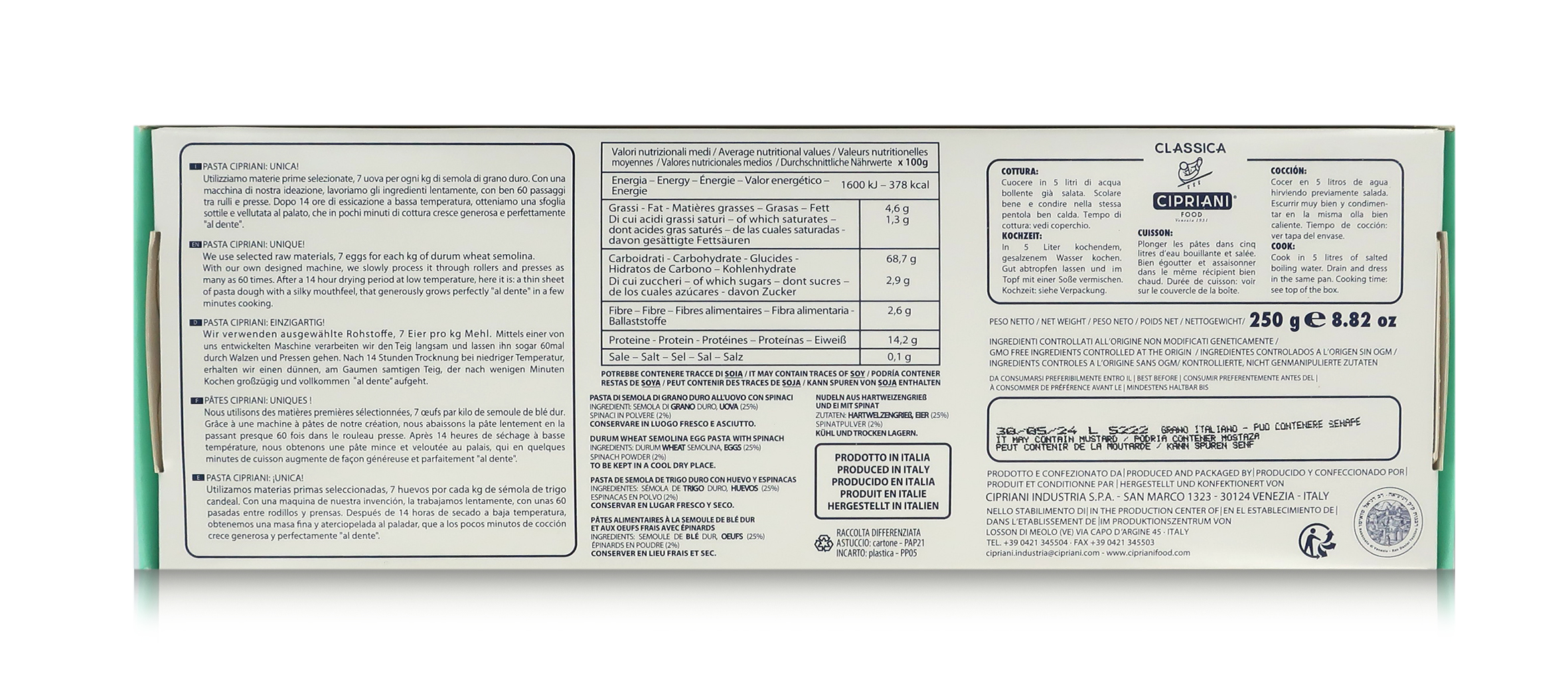 Pasta all'uovo Cipriani: il segreto è ovviamente nella sfoglia, elemento comune a tutti i formati di pasta gourmet Cipriani. 1 kg di semola di grano duro della migliore qualità incontrano 7 uova fresche lavorate con precisione, energia e pazienza. Oltre 80 passaggi e piegature grazie a una macchina esclusiva ideata da Arrigo Cipriani. Dopo 14 ore di essiccazione a bassa temperatura, si ottiene una sfoglia sottile e vellutata al palato, che in pochi minuti di cottura cresce generosa e risulta "al dente". Cipriani Food racchiude una selezione di prodotti che si distingue per gusto e stile. Ottima materia prima, cura nella preparazione e un packaging dal design moderno ed elegante sono i tratti distintivi del brand Cipriani Food, espressione del Made in Italy d'eccellenza.