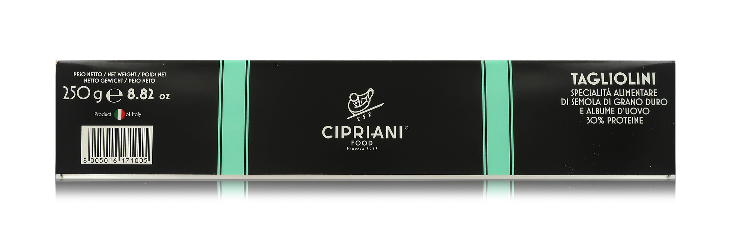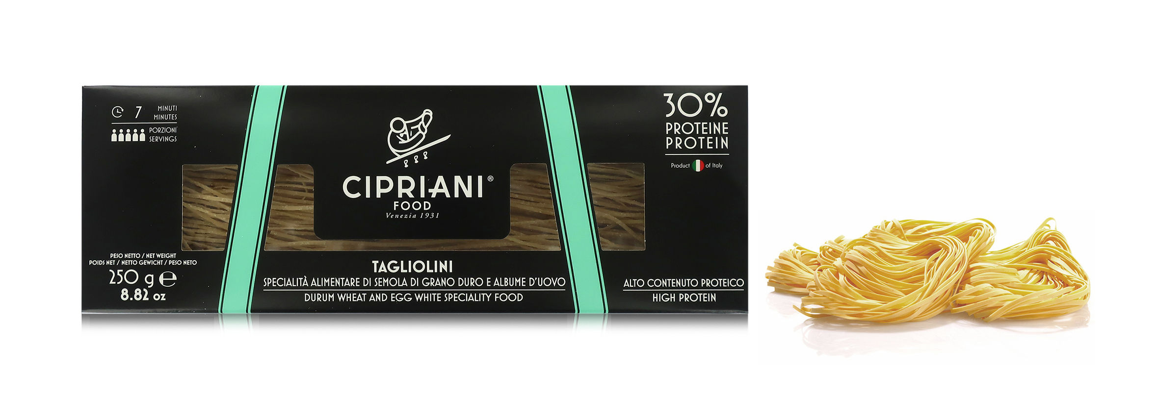 Tagliolini 30% proteine Cipriani: il formato di pasta Cipriani più classico, i tagliolini, si trasforma in una specialità alimentare di semola di grano duro e albume d’uovo. Novità assoluta nel panorama delle paste proteiche, la pasta 30% proteine Cipriani, disponibile nei formati "Tagliarelle" (tipo tagliatelle) e "Tagliolini", combina gusto e consistenza tradizionale con le esigenze dell’alimentazione più moderna.