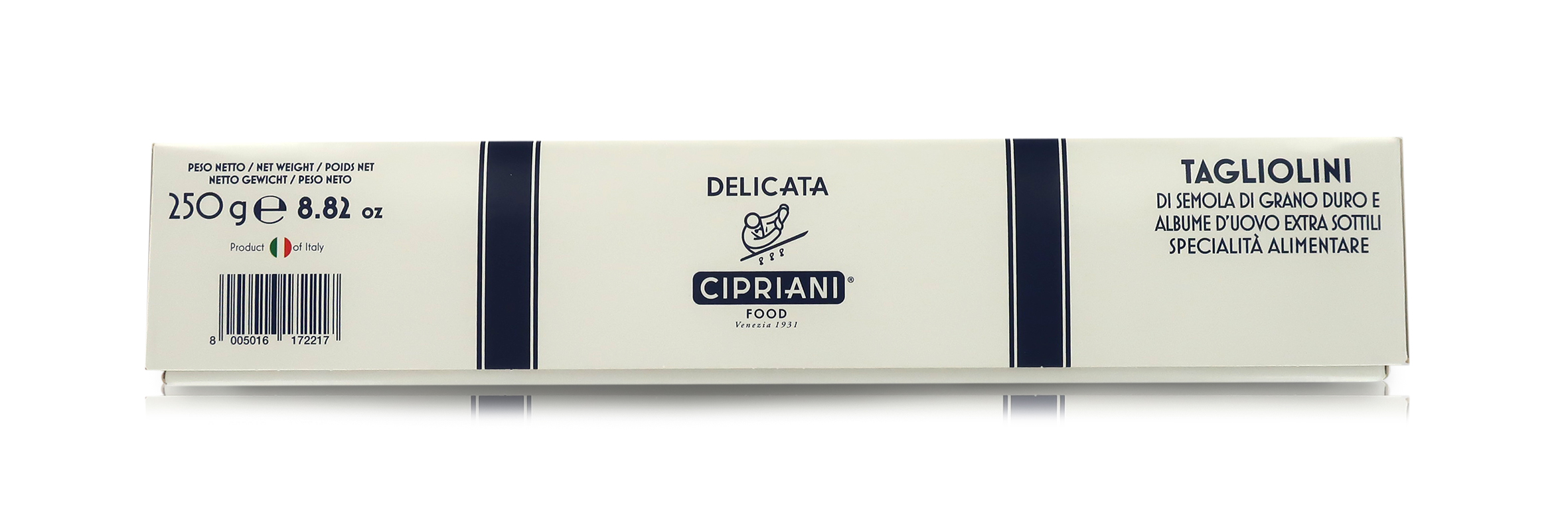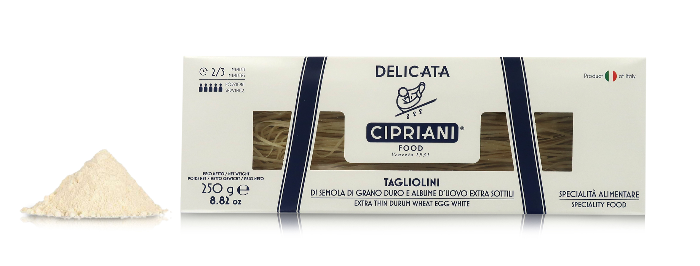 Tagliolini Cipriani senza tuorlo: il sapore, la consistenza e la delicatezza della sfoglia Cipriani da gustare a cuor leggero. Cipriani ha scomposto l’uovo, usando solo le proteine nobili dell’albume, per dar vita a una novità gastronomica ancor più semplice e gustosa. Ideale da abbinare a sughi con crostacei. Il modo migliore per cucinarli è una cottura rapida e il più possibile semplice, conditi con un goccio di vino, aglio, pomodoro e prezzemolo.