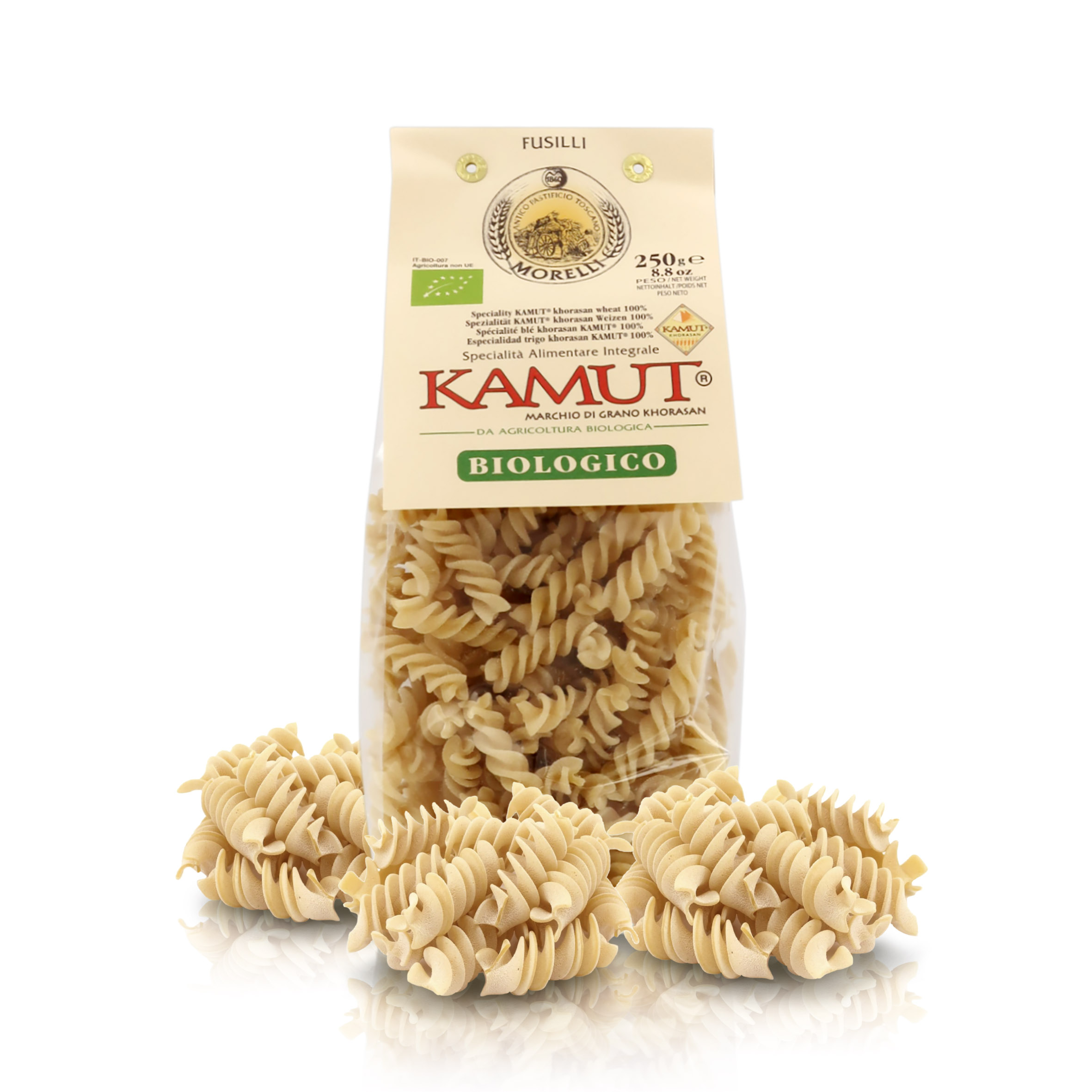 Pasta integrale al kamut bio, formato "Fusilli" (linea "I Cereali"), 8 pacchetti da 250 grammi.