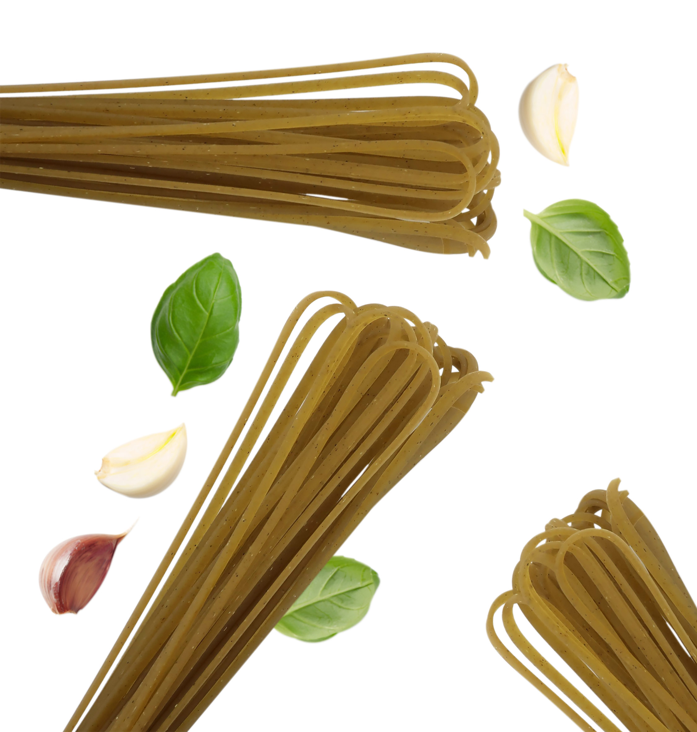 Ingredienti: Semola di grano duro, Acqua, Germe di grano, Basilico in polvere, Aroma naturale di basilico (olio essenziale di basilico, sale), Aroma naturale di aglio (olio essenziale di aglio, sale), Aglio in polvere, Spinaci in polvere.