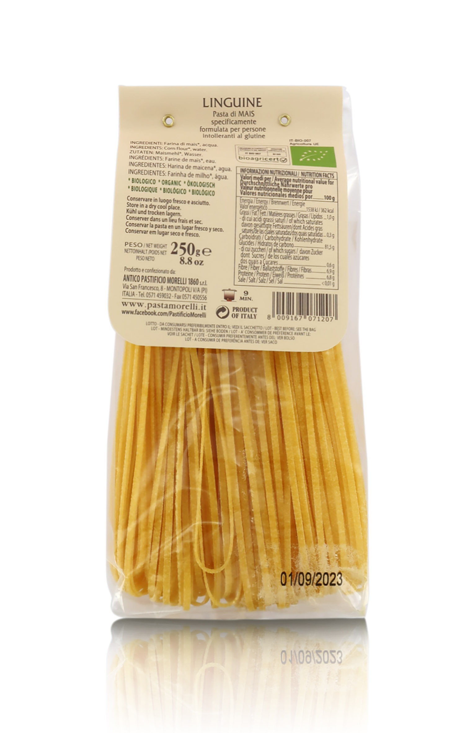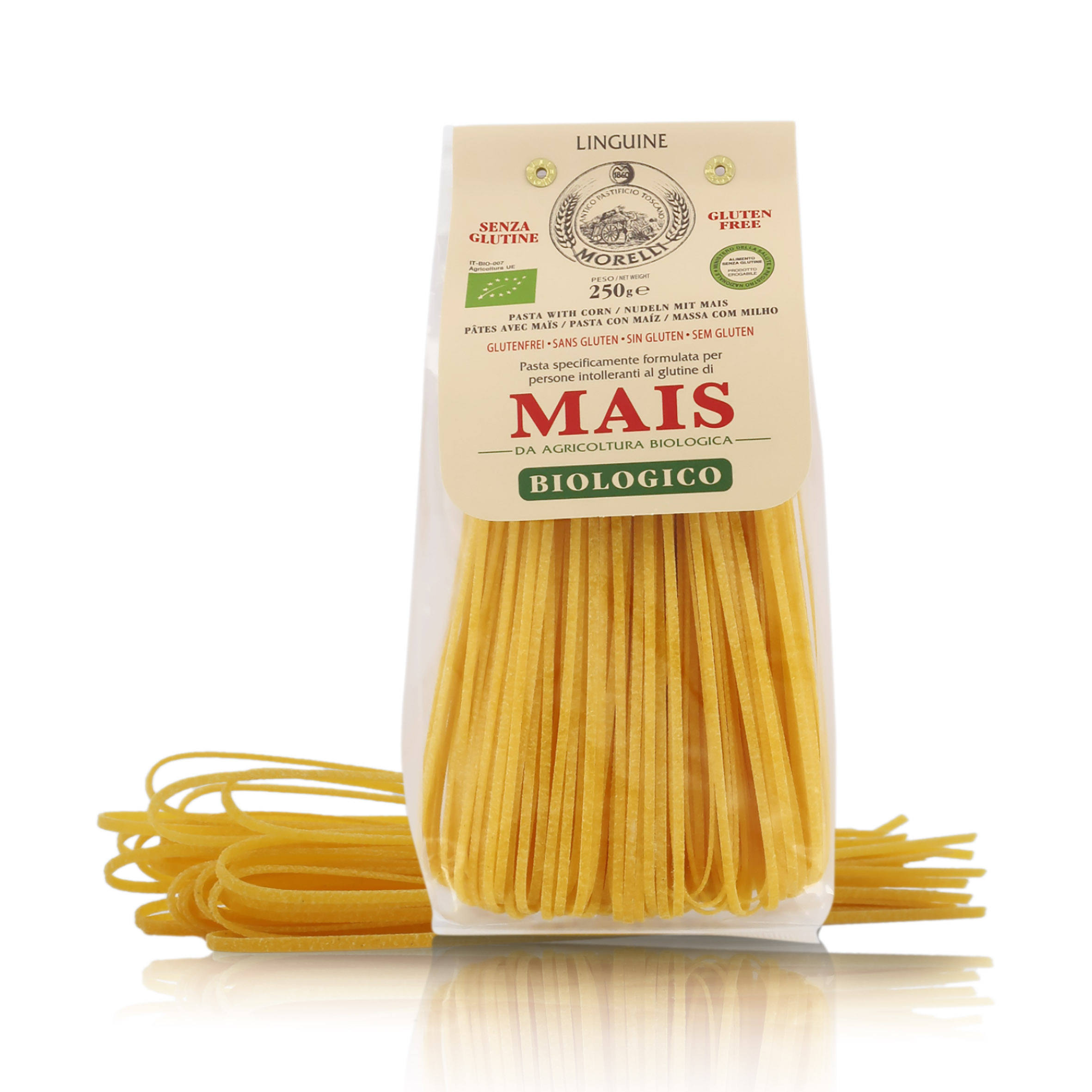 Linguine al mais bio, linea "La pasta di mais e riso", 8 confezioni da 250 grammi. Le paste di questa linea, realizzate con mais e riso, sono particolarmente indicate per soggetti intolleranti al glutine.