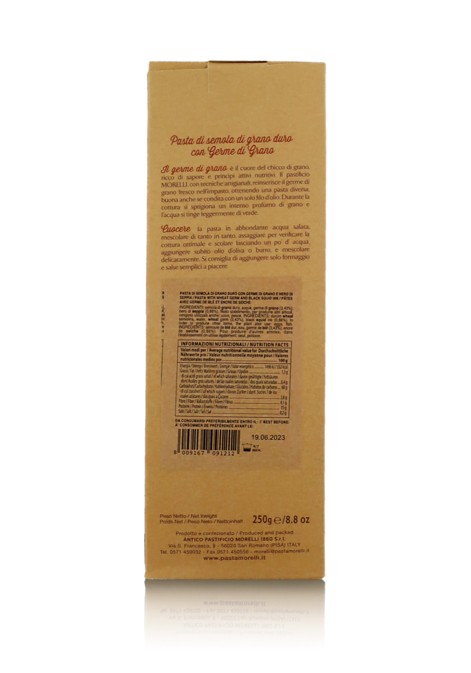La pasta Morelli è preparata artigianalmente in un pastificio a gestione familiare in provincia di Pisa, fondato nel 1860. Ormai da ben 5 generazioni, la pasta viene preparata usando ottime semole di grano duro e tecniche classiche, che includono trafilatura al bronzo ed essiccatura a basse temperature, nel pieno rispetto della tradizione. Fiore all'occhiello della produzione Morelli è la pasta al germe di grano, che impiega un ingrediente naturale solitamente scartato, che la lavorazione artigianale, invece, consente di reintrodurre nell'impasto, donando alla pasta un gusto e un aroma molto particolari. La gamma di paste Morelli include: pasta al germe di grano, le tipicità regionali, la pasta all'uovo e germe di grano, la pasta integrale di filiera Toscana e integrale Senatore Cappelli, pasta di legumi, pasta senza glutine, grani antichi, farro e kamut, pasta aromatizzata monogusto, multicolore e articoli da regalo.