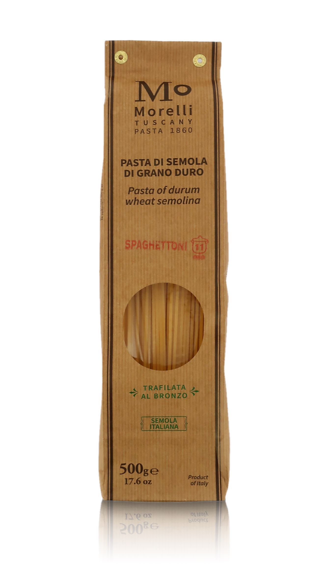 Spaghettoni, pasta di semola di grano duro, 12 confezioni da 500 grammi. Cottura: 11 minuti.