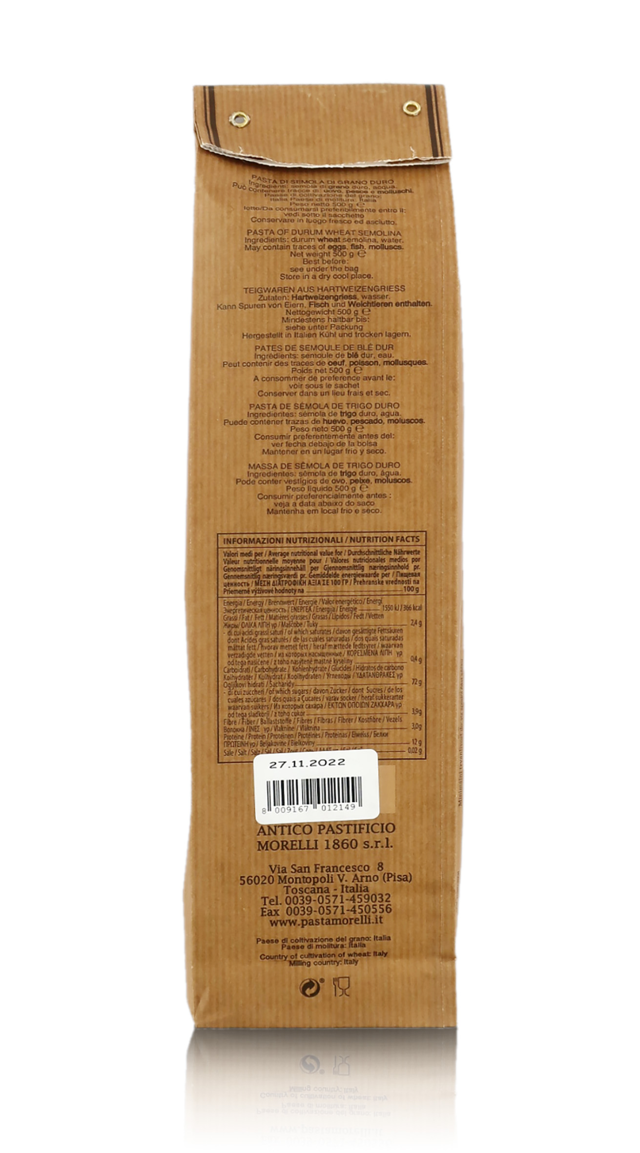 La pasta Morelli è preparata artigianalmente in un pastificio a gestione familiare in provincia di Pisa, fondato nel 1860. Ormai da ben 5 generazioni, la pasta viene preparata usando ottime semole di grano duro e tecniche classiche, che includono trafilatura al bronzo ed essiccatura a basse temperature, nel pieno rispetto della tradizione. Fiore all'occhiello della produzione Morelli è la pasta al germe di grano, che impiega un ingrediente naturale solitamente scartato, che la lavorazione artigianale, invece, consente di reintrodurre nell'impasto, donando alla pasta un gusto e un aroma molto particolari. La gamma di paste Morelli include: pasta al germe di grano, le tipicità regionali, la pasta all'uovo e germe di grano, la pasta integrale di filiera Toscana e integrale Senatore Cappelli, pasta di legumi, pasta senza glutine, grani antichi, farro e kamut, pasta aromatizzata monogusto, multicolore e articoli da regalo.