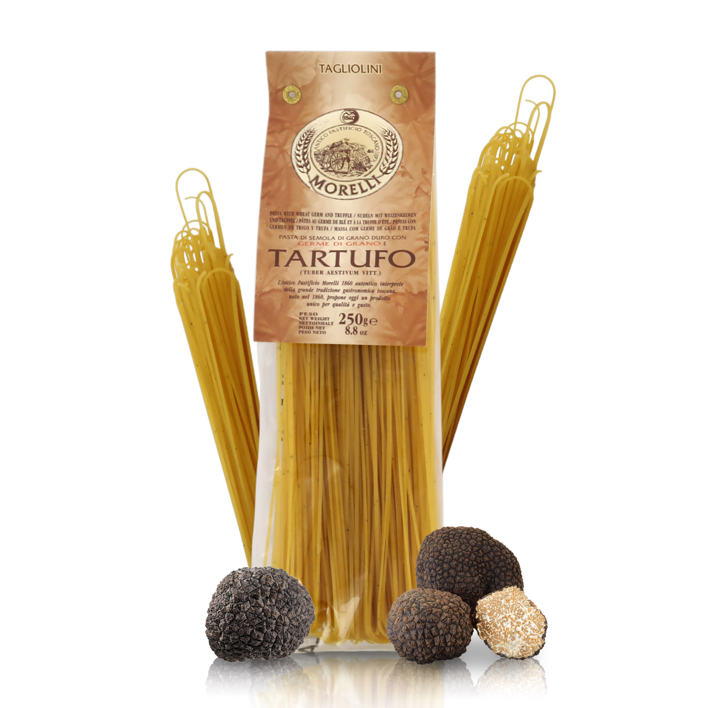 Tagliolini al tartufo, pasta aromatizzata, 8 confezioni da 250 grammi.