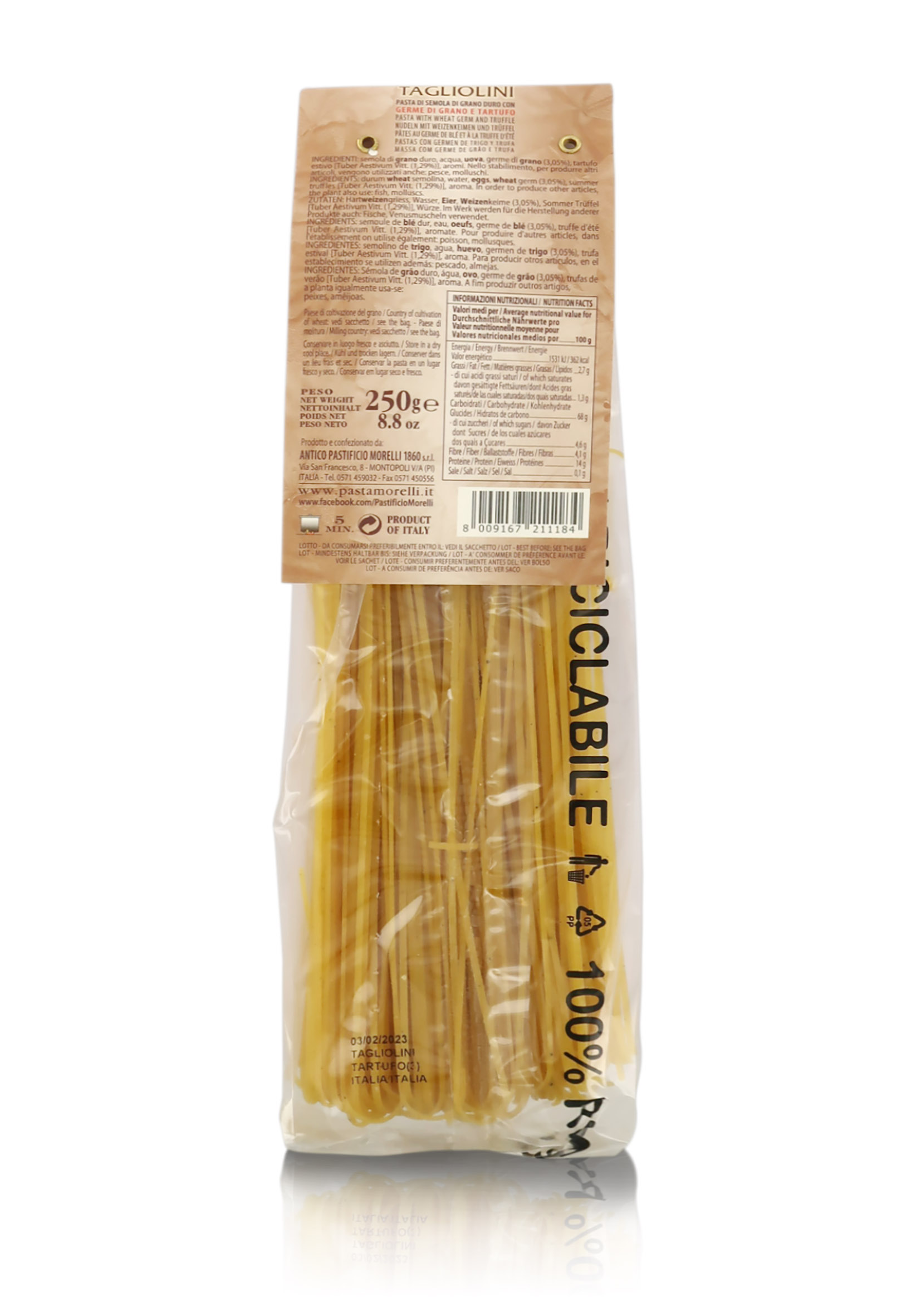 Ingredienti: Semola di grano duro, Acqua, Uova, Germe di grano, Tartufo nero estivo, Aromi.