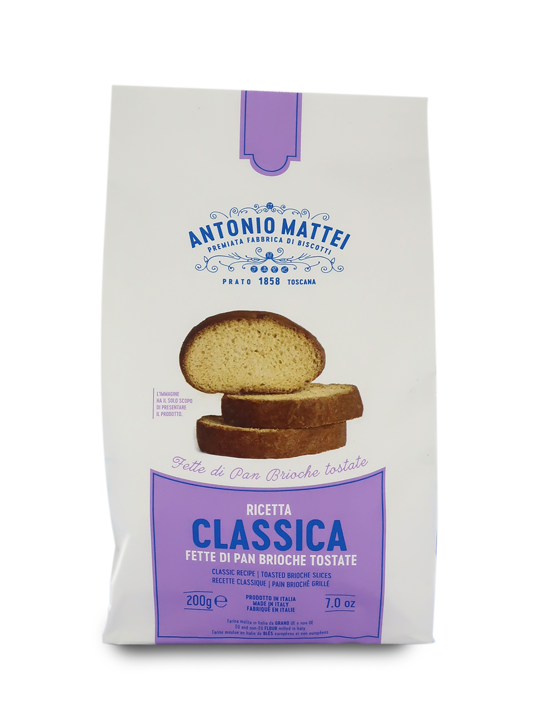 Un classico del Biscottificio Mattei, questi Biscotti della Salute sono ottimi per una colazione gustosa e tradizionale. Sono fette di pane brioche, piacevolmente spesse (circa 1,5 cm) e sapientemente tostate, perfette da usare al posto delle solite fette biscottate di produzione industriale. Il segreto dei Biscotti della Salute Mattei consiste nella doppia e lenta lievitazione della pasta brioche. Il Pane briosciato, ancora soffice, viene lasciato riposare e poi tagliato, per essere successivamente tostato e ottenere così un bel colore dorato e la tipica consistenza friabile e leggera. Sono preparati ancora secondo la ricetta originale. Privi di conservanti, sciroppo di glucosio e coloranti.