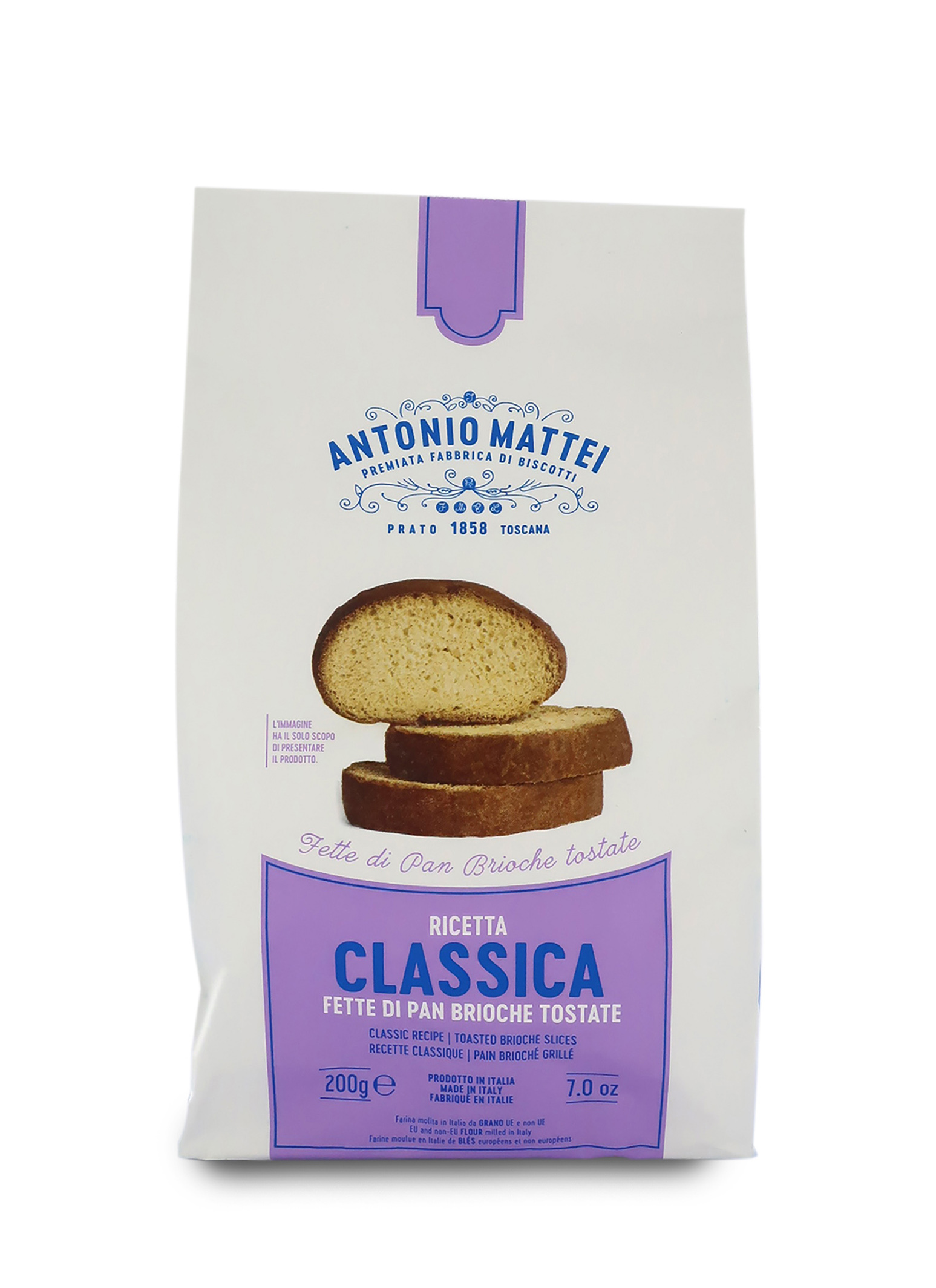 Un classico del Biscottificio Mattei, questi Biscotti della Salute sono ottimi per una colazione gustosa e tradizionale. Sono fette di pane brioche, piacevolmente spesse (circa 1,5 cm) e sapientemente tostate, perfette da usare al posto delle solite fette biscottate di produzione industriale. Il segreto dei Biscotti della Salute Mattei consiste nella doppia e lenta lievitazione della pasta brioche. Il Pane briosciato, ancora soffice, viene lasciato riposare e poi tagliato, per essere successivamente tostato e ottenere così un bel colore dorato e la tipica consistenza friabile e leggera. Sono preparati ancora secondo la ricetta originale. Privi di conservanti, sciroppo di glucosio e coloranti.