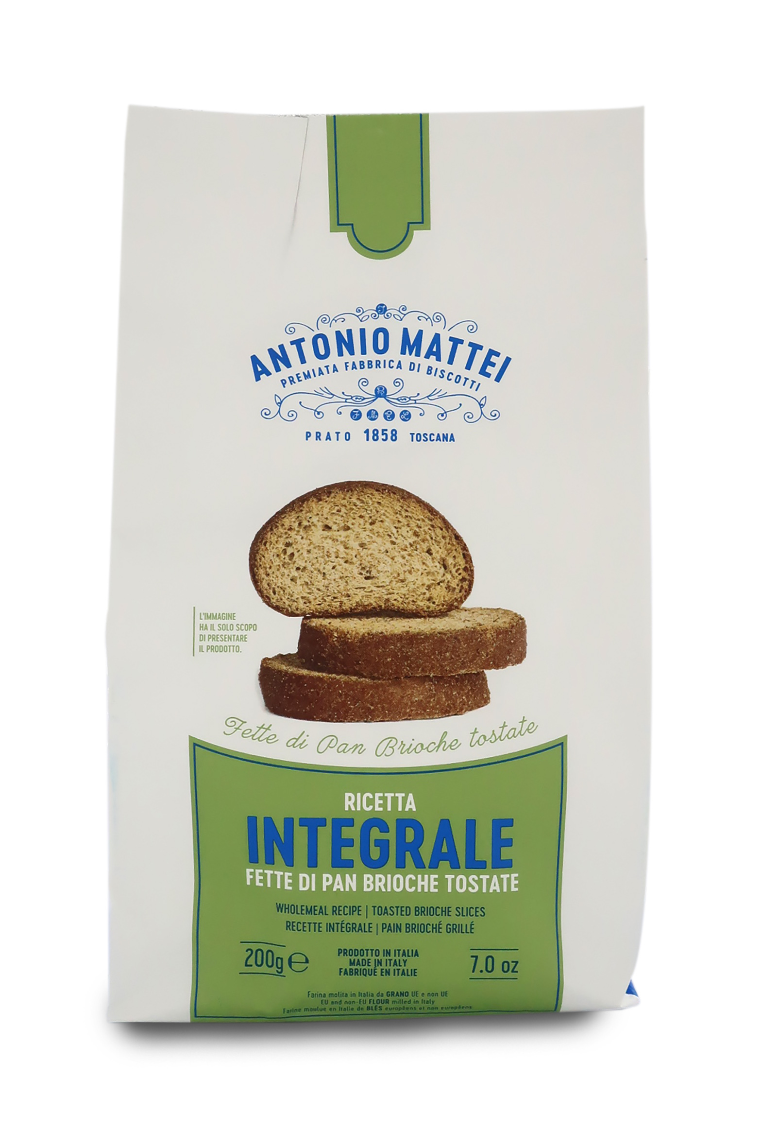 Un classico del Biscottificio Mattei, questi Biscotti della Salute nella variante integrale sono ottimi per una colazione gustosa e tradizionale, con un occhio di riguardo a fibre e nutritivi. Prive di conservanti, sciroppo di glucosio e coloranti, queste fette di pane brioche, piacevolmente spesse (circa 1,5 cm) e sapientemente tostate, sono perfette da usare al posto delle solite fette biscottate di produzione industriale. Il segreto dei Biscotti della Salute Mattei consiste nella doppia e lenta lievitazione della pasta brioche. Il Pane briosciato, ancora soffice, viene lasciato riposare e poi tagliato, per essere successivamente tostato e ottenere così un bel colore dorato e la sua tipica consistenza friabile e leggera. Ottime sia con burro e marmellata o con della crema di nocciole, si prestano anche ad abbinamenti salati con burro e acciughe.