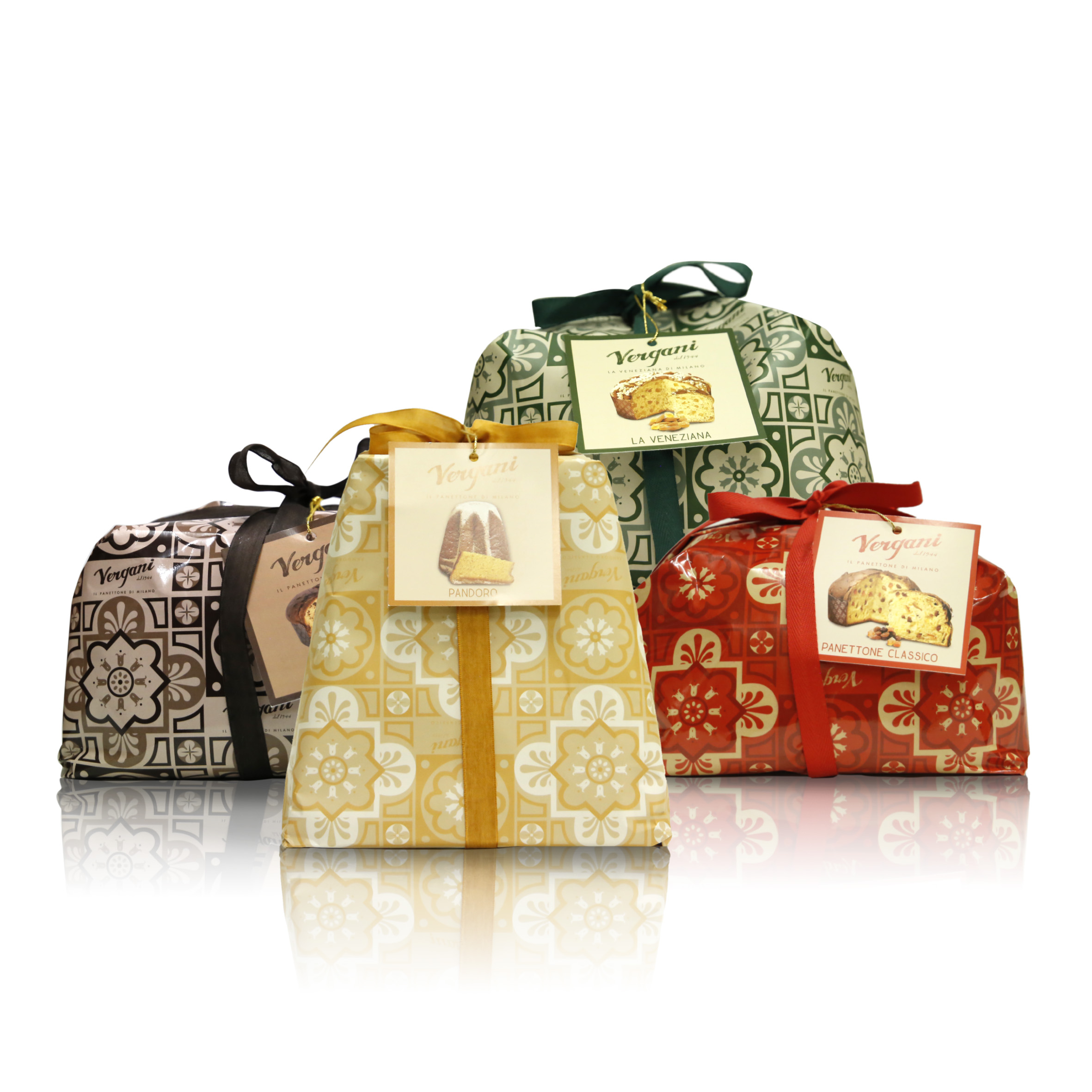1 panettone ai tre cioccolati; 1 panettone classico; 1 pandoro e 1 veneziana.