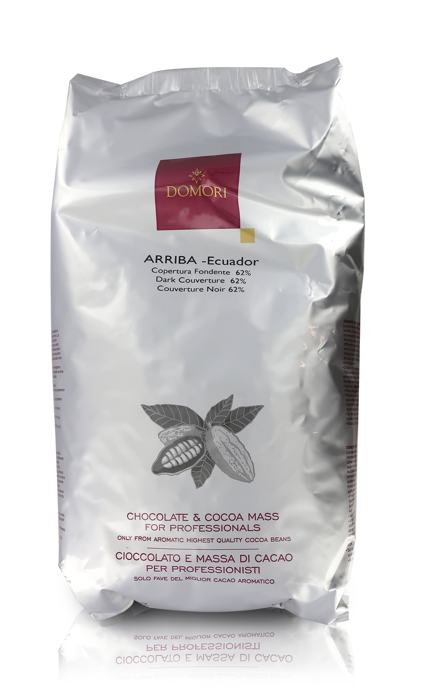 Pensato appositamente per il canale della ristorazione e le pasticcerie, questo maxi sacco Domori da 5 kg di coperture di cioccolato fondente al 62 % della conosciuta variante Arriba Nacional in pastiglie permette una facile e veloce creazione di molti dolci, che essi siano per colazione, pranzo o cena