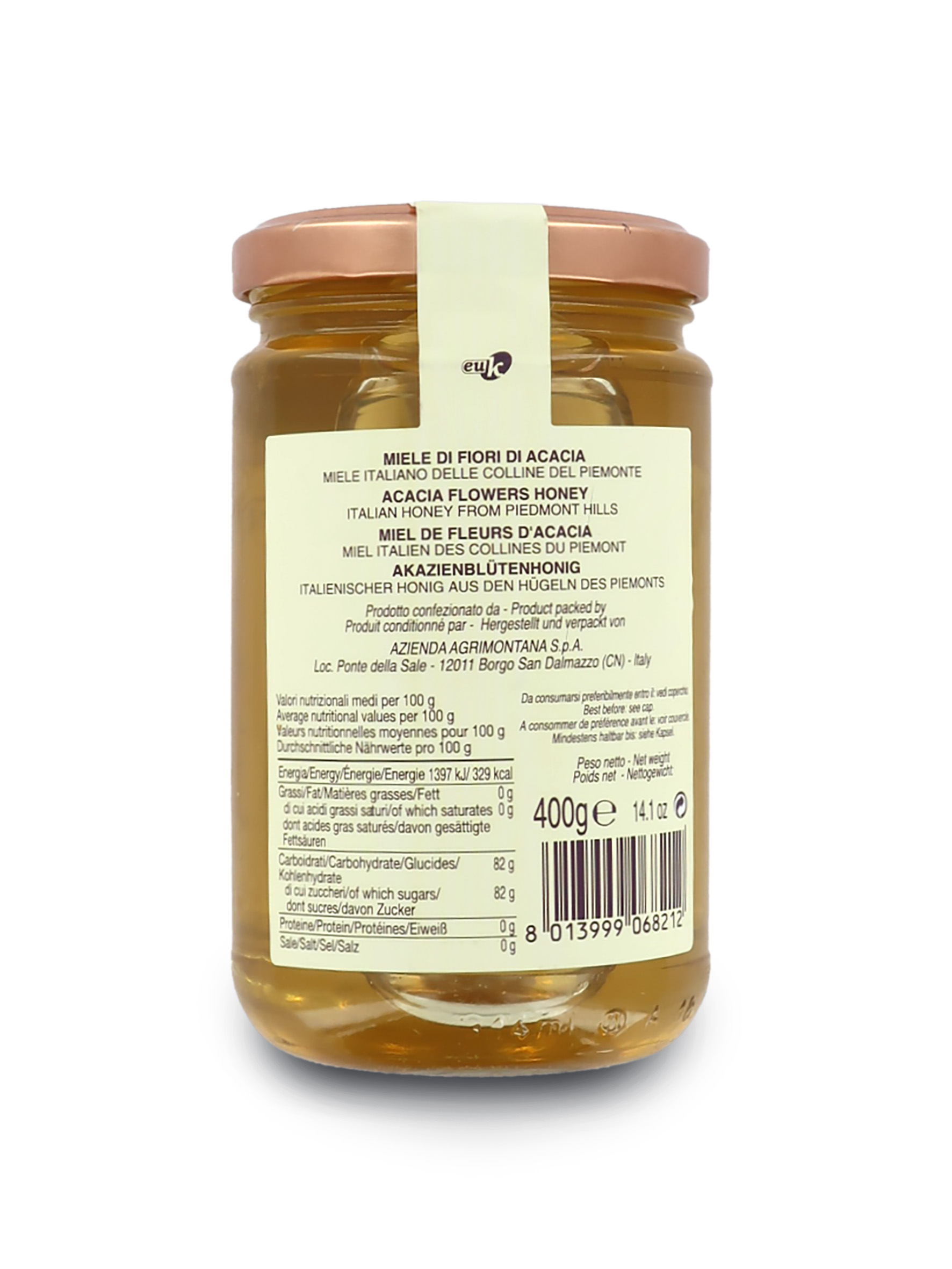Il miele di acacia è lavorato al di sotto di 45 °C per mantenere le proprietà dei micronutrienti. Il miele d’acacia è uno dei pochi mieli che restano liquidi grazie alla composizione pollinica del nettare del suo fiore. Vanta un colore molto chiaro e una profumazione delicata, leggera, come lo è il sapore, che ricorda il profumo dei fiori e della vaniglia.