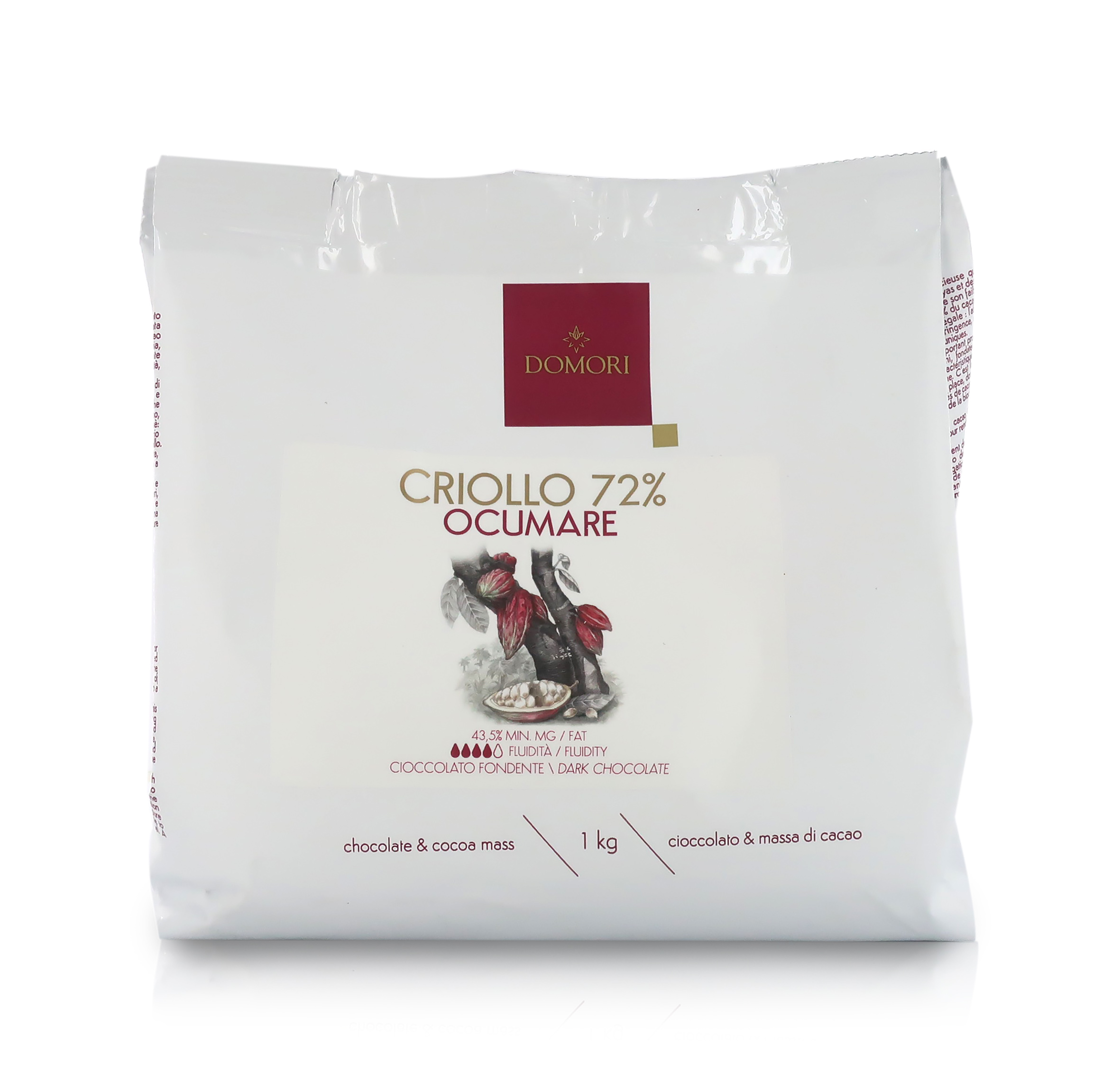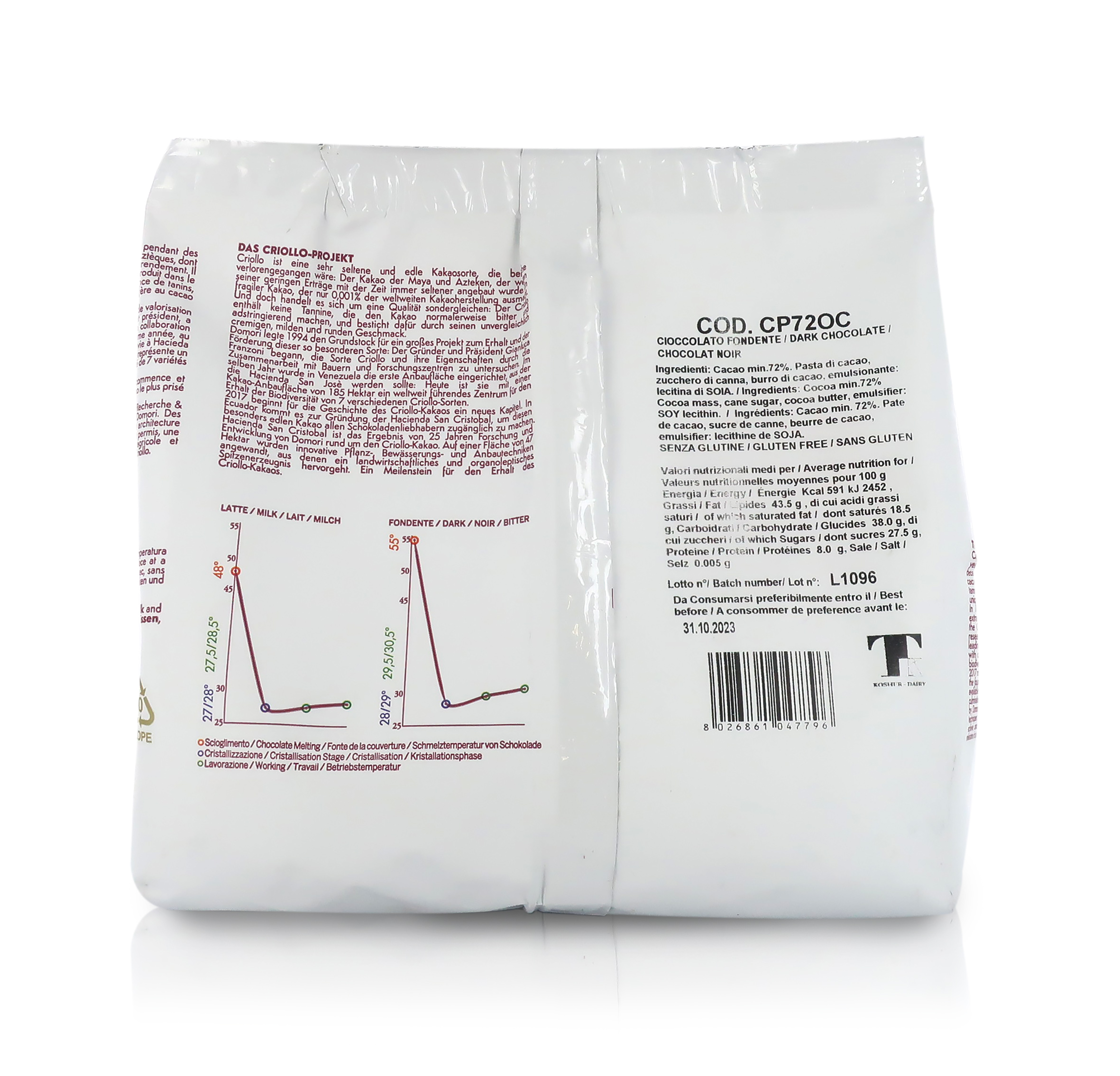 Gocce di cioccolato gourmet particolarmente raccomandate per gusci, farciture, coperture, decorazioni, mousse e gelati. Sacchetto da 1 kg (2.2lb). Questo cioccolato fondente Ocumare realizzato con cacao Criollo 72% vanta una fluidità medio-alta e una materia grassa del 43,5% min. Il gusto è tipico del cioccolato fondente, con note di caramello, tabacco, noci, papaia, sottobosco, funghi e datteri. Temperatura di scioglimento: 55 °C, cristallizzazione a circa 28/29 °C e lavorazione intorno ai 29,5/30,5 °C. Senza glutine e senza OGM. Origine: Venezuela.