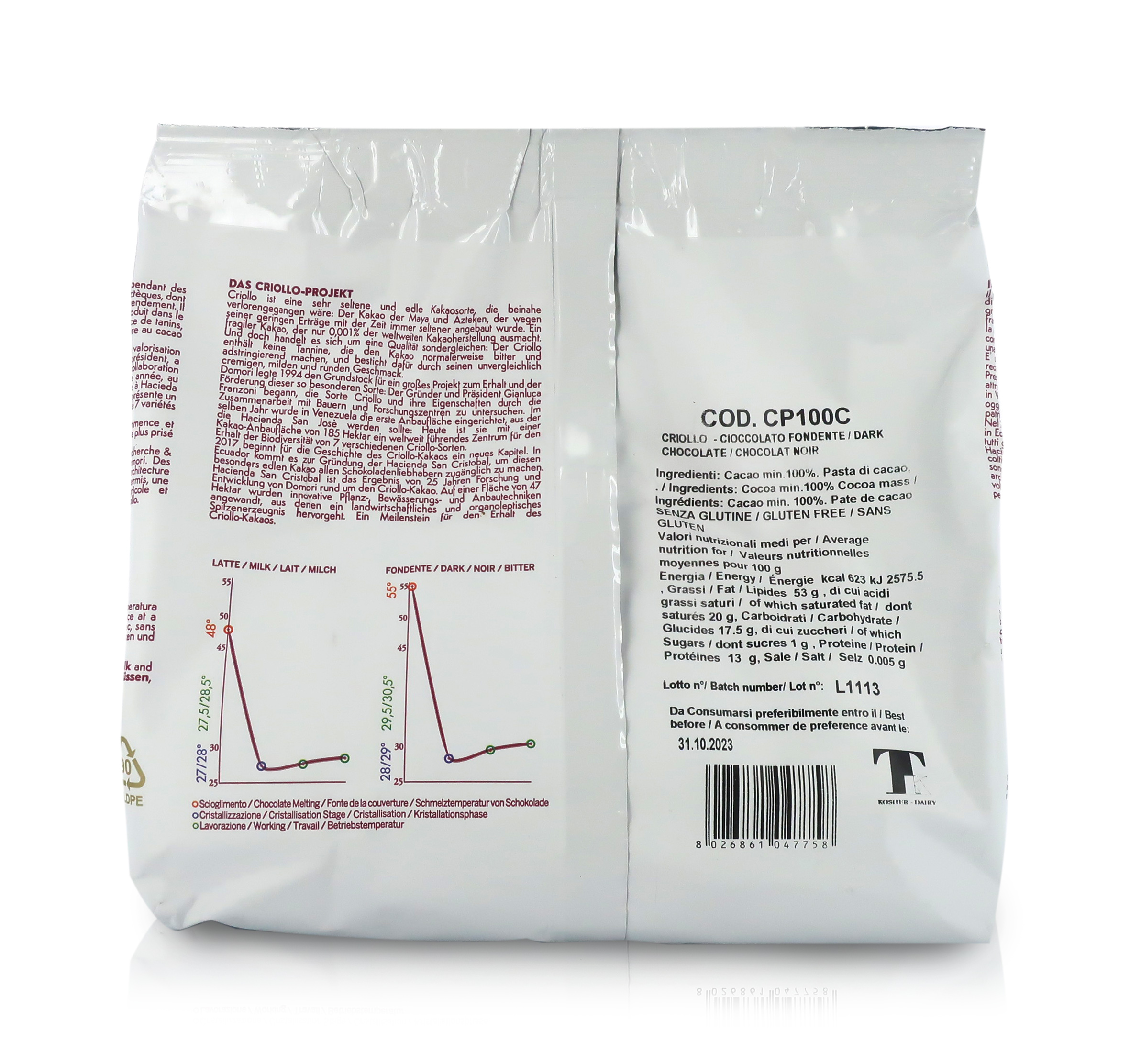 Gocce di cioccolato gourmet particolarmente raccomandate per la preparazione di gelato. Sacchetto da 1 kg (2.2lb). Realizzate con massa di cacao, queste gocce di Ocumare (Criollo 100% Fondente) vantano una grande fluidità e una materia grassa del 53% min. Il gusto è tipico del cioccolato fondente con note di caramello, tabacco, noci, papaia, sottobosco, funghi e datteri. Temperatura di scioglimento: 55 °C, cristallizzazione a circa 28/29 °C e lavorazione intorno ai 29,5/30,5 °C. Senza glutine. Senza OGM. Origine: Venezuela.