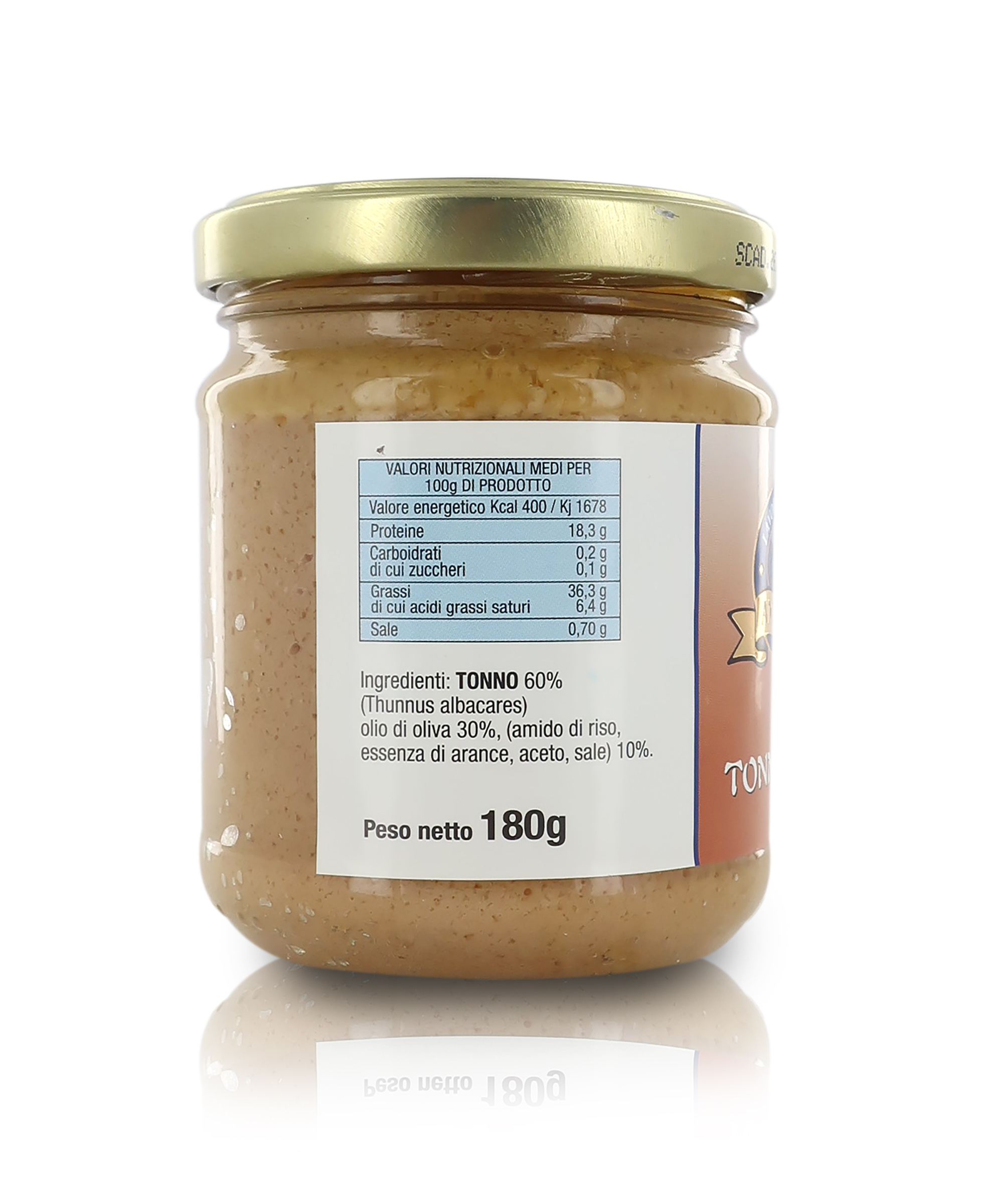 Ingredienti: TONNO del mediterraneo, olio di oliva, essenza di arance, aceto, sale marino, aromi naturali. Riporre in frigo dopo l’apertura e consumare entro 1/3 giorni.