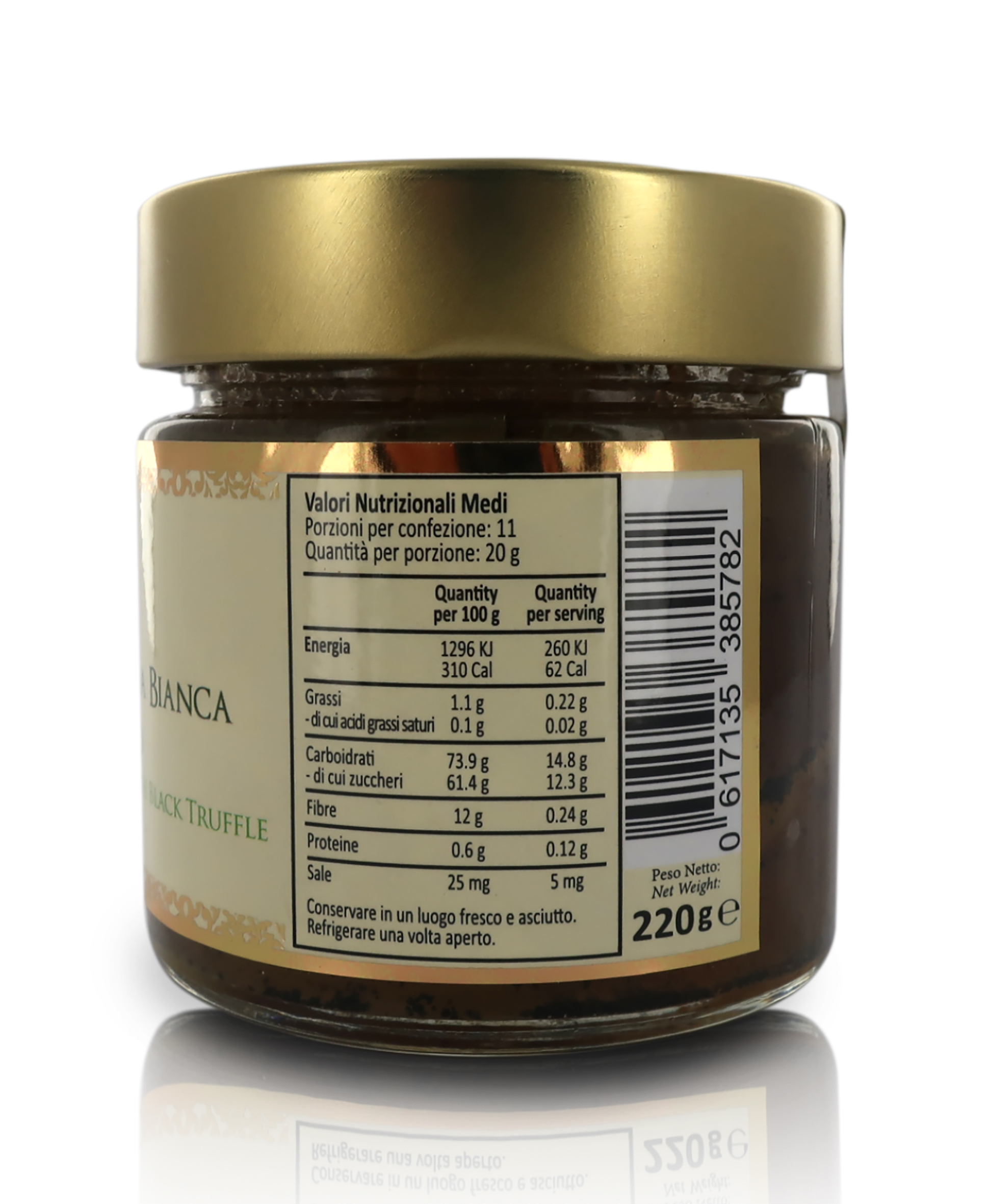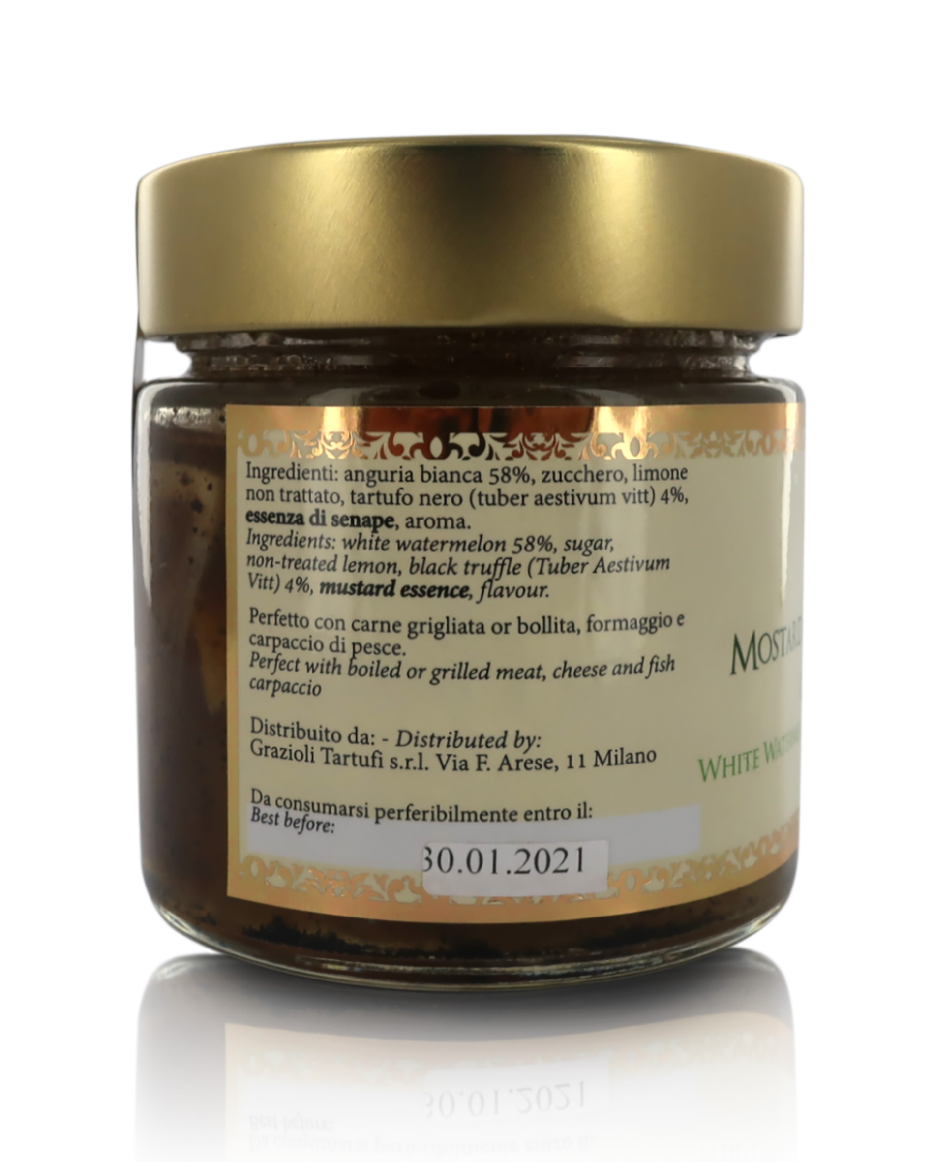 Ingredienti: anguria bianca 58%, zucchero, limone non trattato, tartufo nero (Tuber Aestivum Vitt) 4%, essenza di senape, aroma.