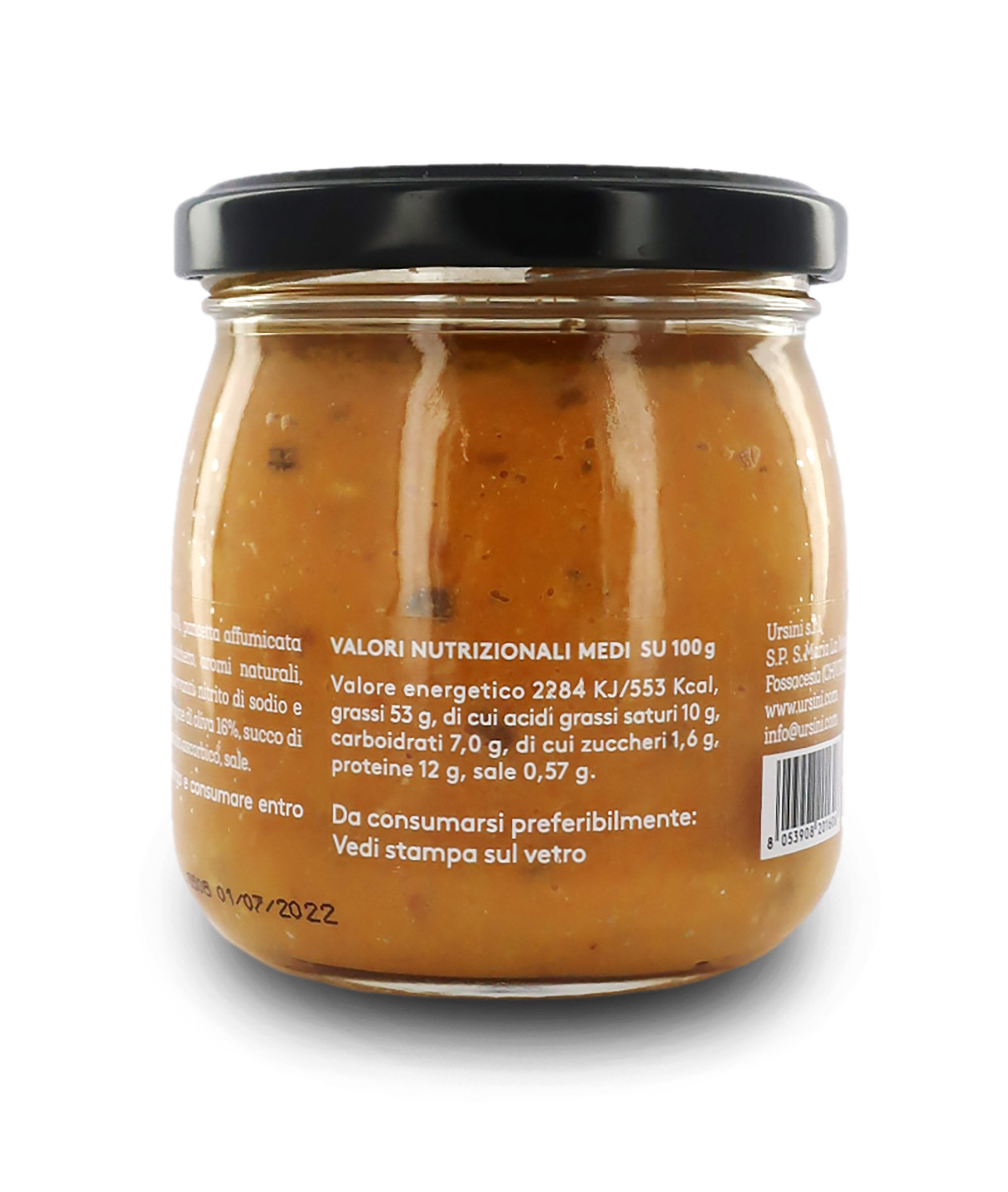 Ingredienti: carote 30%, cipolla 30%, pancetta affumicata (carne di suino, sale, destrosio, zucchero, aromi naturali, antiossidante: acido ascorbico, conservanti: nitrito di sodio e nitrato di potassio) 18%, olio extravergine di oliva 16%, acqua, succo di limone, rosmarino, antiossidante: acido ascorbico, sale.