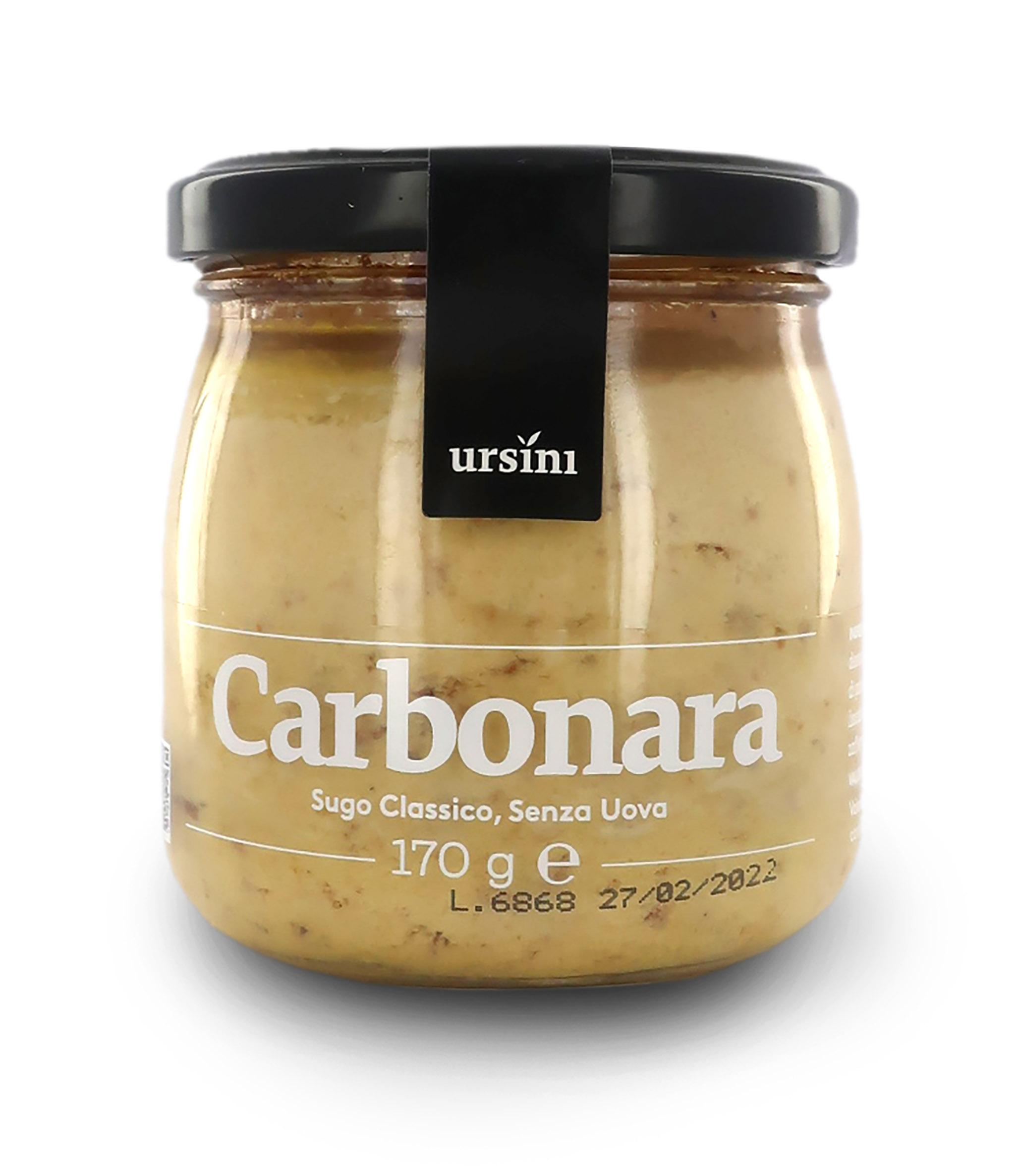 Rivisitazione di uno dei condimenti più famosi e amati dai buongustai italiani. Ursini propone il sugo per carbonara senza uova, realizzato con panna e con gli immancabili pancetta affumicata e grana padano DOP. Il tutto è legato da olio extravergine di qualità Ursini, a cui si aggiungono anche vino bianco, cipolla, pepe e zafferano, per un tocco aromatico che rende questo condimento per carbonara senza uovo una particolare e altrettanto gustosa alternativa ai sughi classici. Ottimo da gustare con spaghetti, linguine, fusilli e rigatoni.