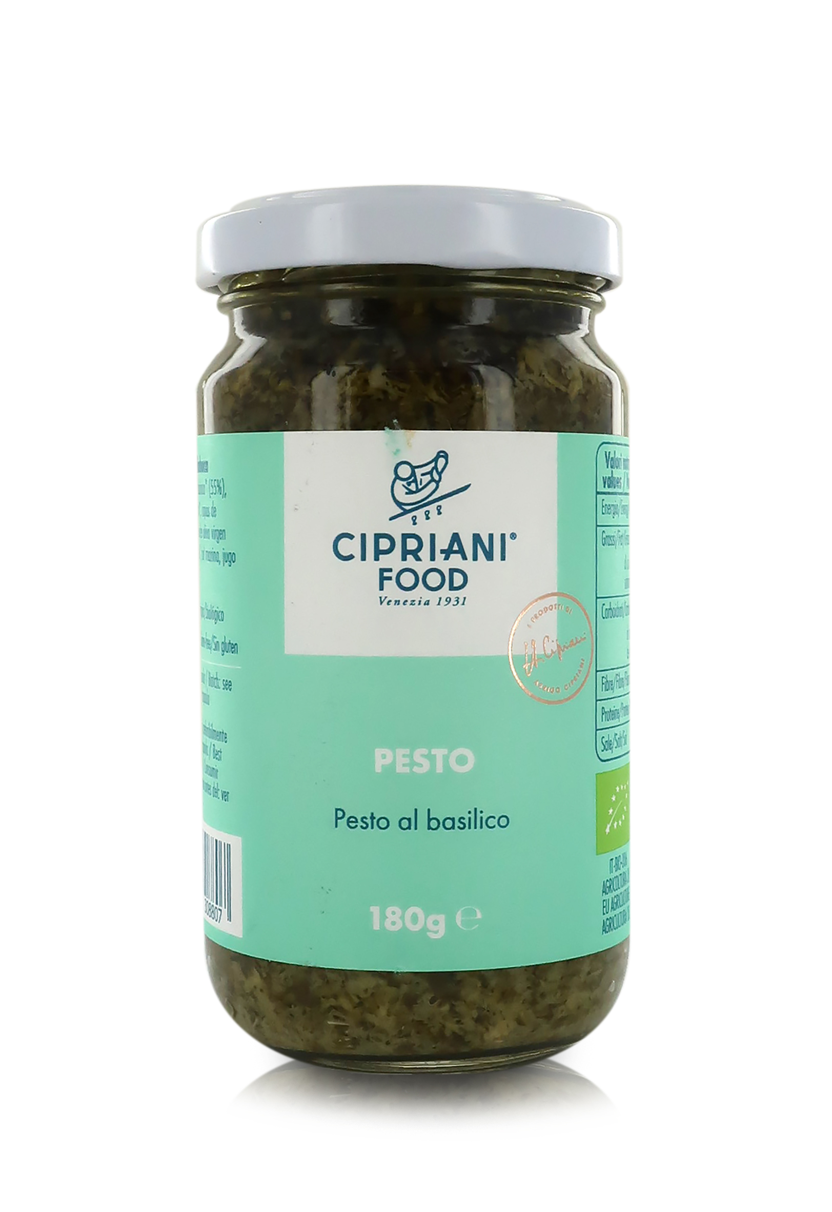 Pesto Cipriani: 100% basilico toscano e olio extravergine di oliva. Un pesto dal gusto deciso, il basilico Cipriani viene lavorato nel più breve tempo possibile, in modo da mantenere tutto l’aroma e il gusto delle foglie appena raccolte. L’assenza di aglio e formaggio tra gli ingredienti lo rende più digeribile. Da utilizzare non solo per condire la pasta, ma anche da spalmare direttamente sul pane, o come condimento sulle patate lesse e sulle carni, a mo' di salsa verde. Da impiegare su pietanze già calde, quindi non necessita di essere scaldato (da consumare a temperatura ambiente).