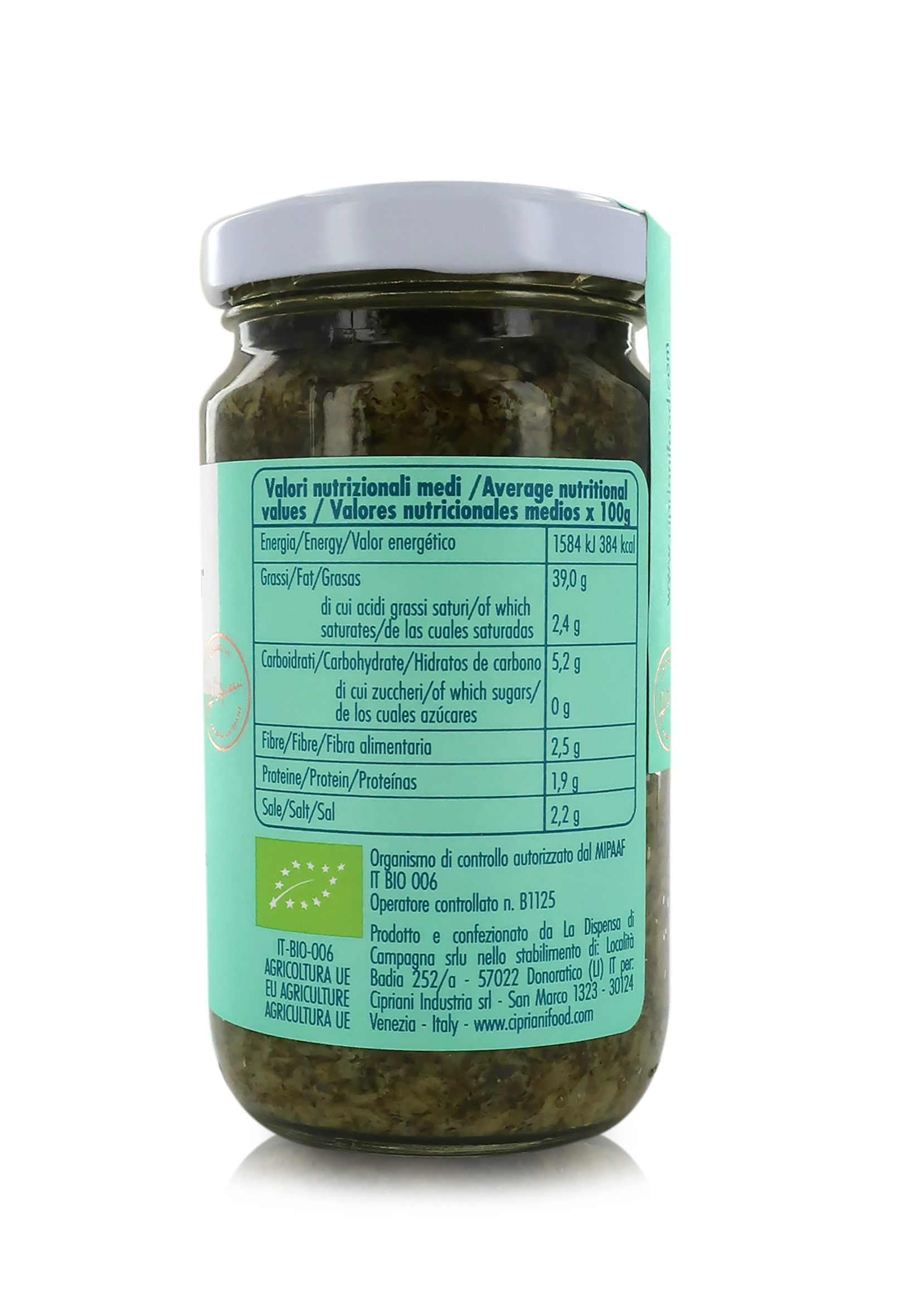 Cipriani Pesto di Basilico Bio Senza Aglio e Senza Formaggio, Pesto Leggero / Delicato, Agricoltura Biologica UE, Condimento per Pasta, Crostini o Verdure, 180g