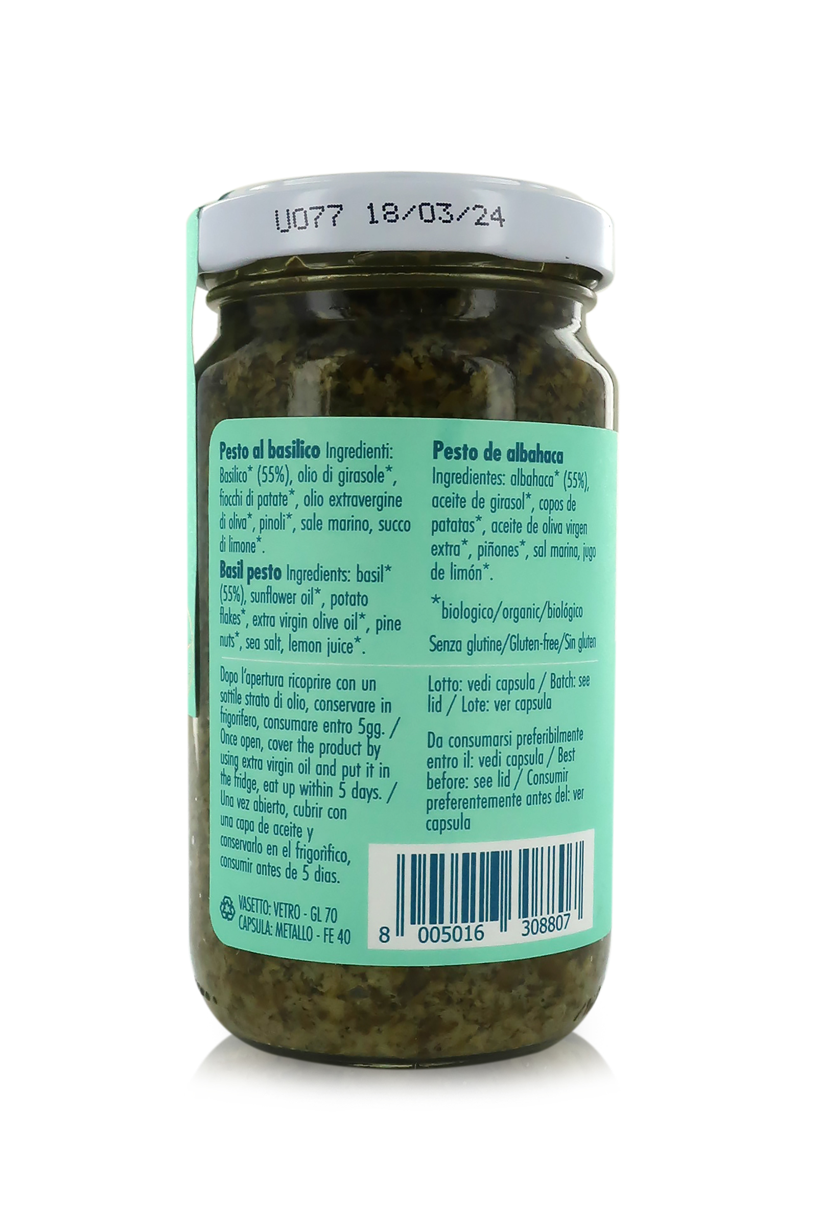 Pesto biologico (agricoltura EU) dal gusto genuino e autentico, in pratico vasetto di vetro da 180g. Si distingue dagli altri pesti in commercio grazie alla pronunciata nota erbacea/vegetale, simbolo di una materia prima, il basilico, che viene lavorata freschissima.