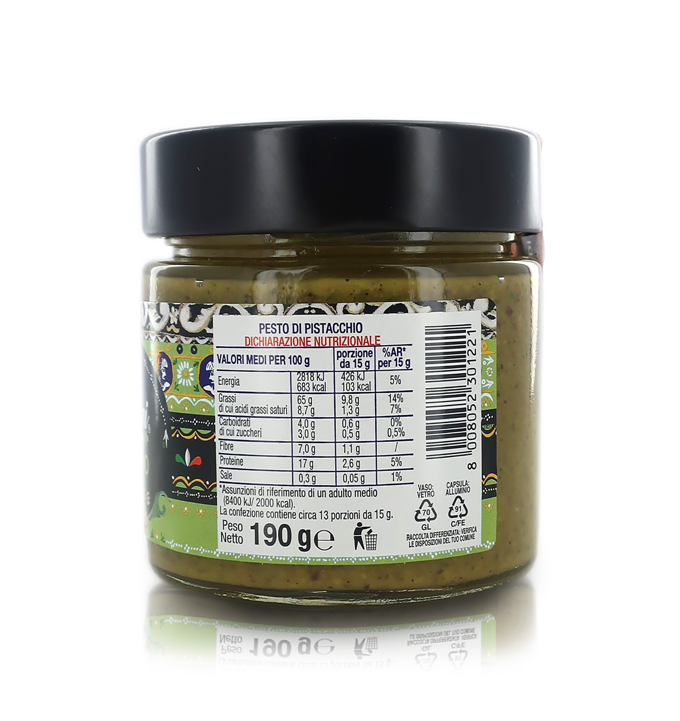 Ingredienti: PISTACCHIO (65%) (origine UE e non UE), olio di semi di girasole, sale, pepe nero. Possibile presenza di frammenti di guscio. Può contenere tracce di ARACHIDI. Senza glutine.