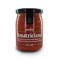 Sugo al gusto classico "amatriciana", pronto da scaldare (in soli 2/3 minuti) e da consumare. Contiene pomodoro pelato e olio extravergine di oliva, ed è insaporito con guanciale stagionato di maiale, cipolla, vino bianco, sale e pepe. Il gusto del pomodoro, unito alla grande sapidità del guanciale stagionato, sono protagonisti in questo sugo, condimento tra i più amati della tradizione culinaria italiana.