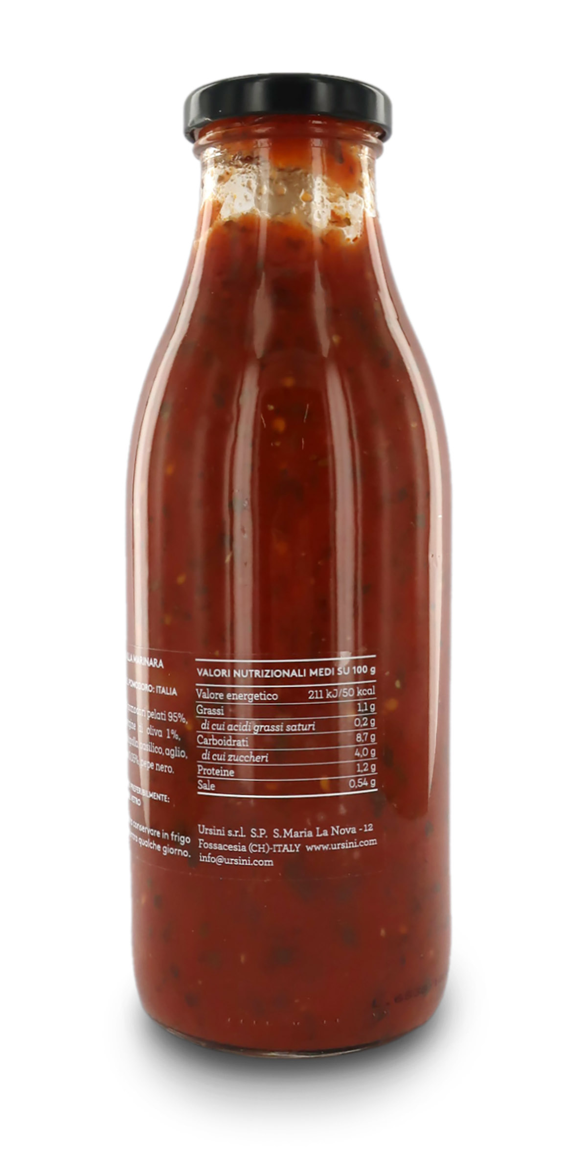 Sugo al gusto classico "marinara", pronto da scaldare e da consumare. Contiene pomodoro, origano e olio extravergine di oliva, ed è insaporito con prezzemolo, cipolla, basilico, aglio e pepe. La semplicità e la genuinità del gusto del pomodoro sono protagoniste in questo sugo, condimento tra i più classici della tradizione culinaria italiana.
