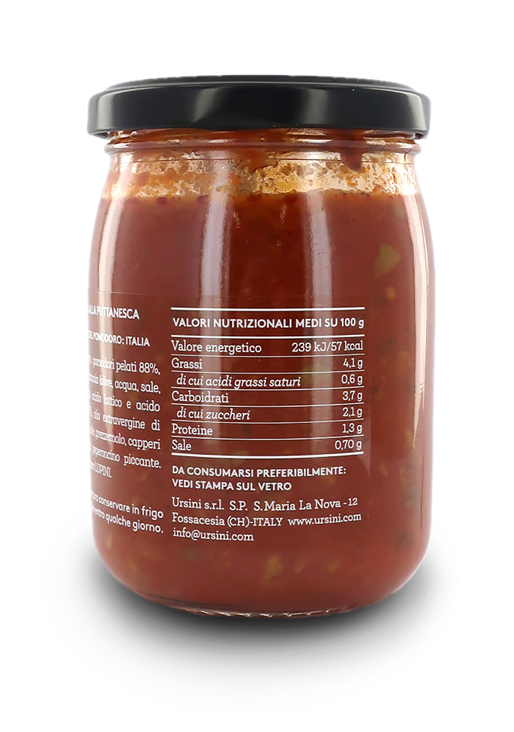 Sugo pronto a base di pomodoro con olive, capperi e olio extra vergine di oliva.