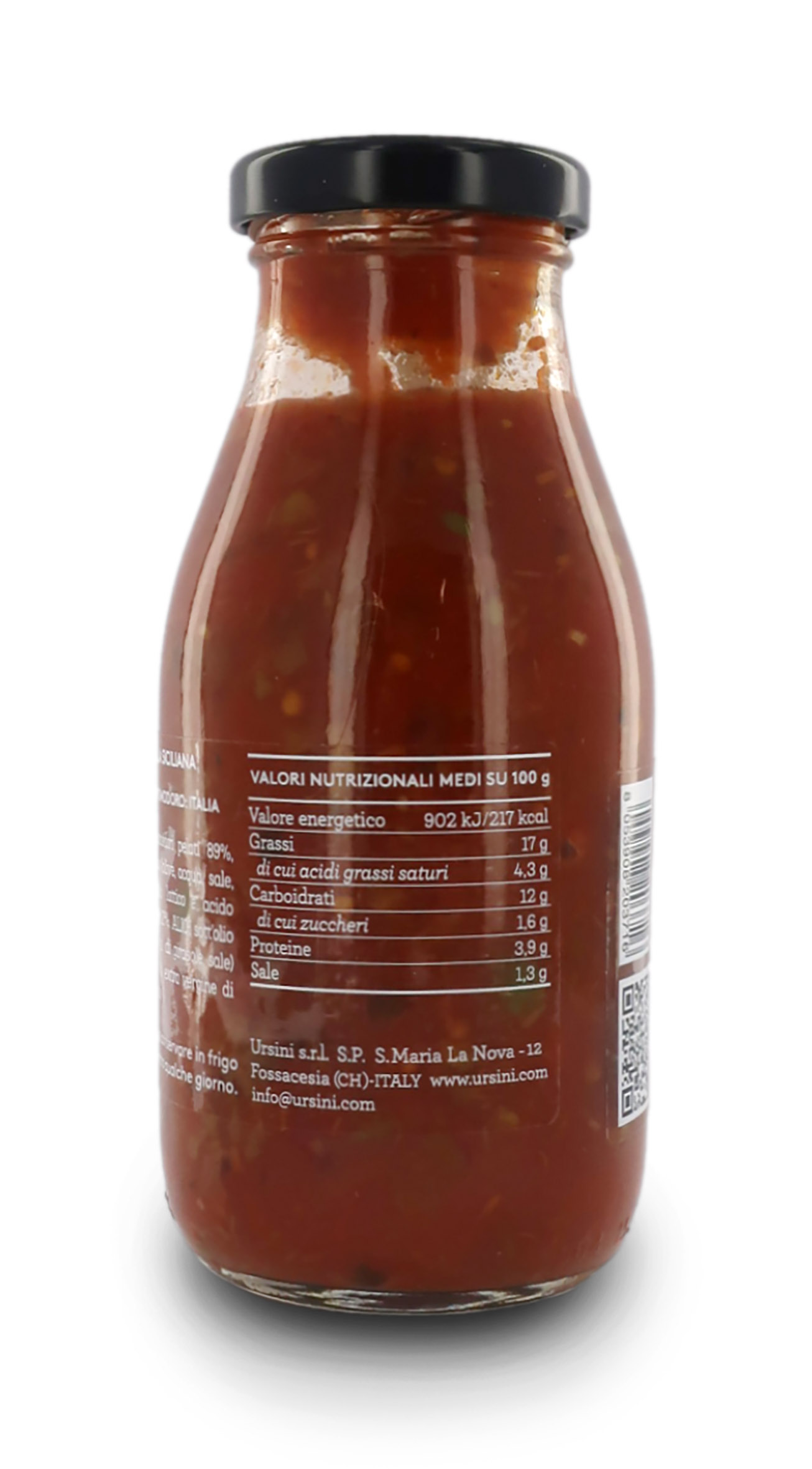 Ingredienti: pomodori pelati (origine del pomodoro: Italia) 89%, olive in salamoia (olive, acqua sale, acidificanti: acido lattico e acido citrico) 5%, capperi 2%, ALICI sott'olio (ALICI, olio di semi di girasole, sale) 2%, aglio, sale, olio extravergine di oliva, prezzemolo.