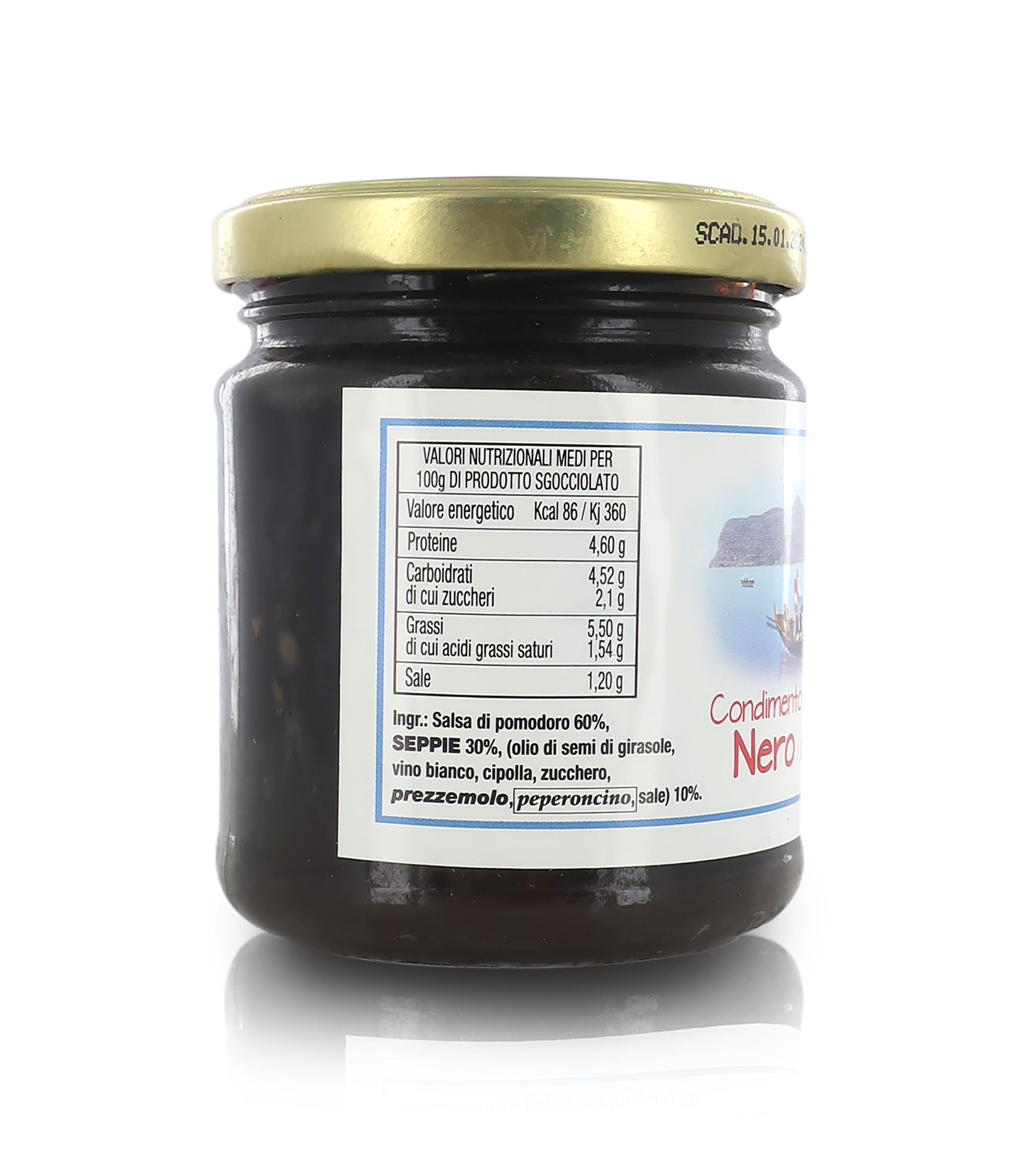 Ingredienti: SEPPIE, estratto di pomodoro, olio extravergine d'oliva, sale. Conservare in frigo dopo l’apertura del vasetto e consumare entro 1/3 giorni.
