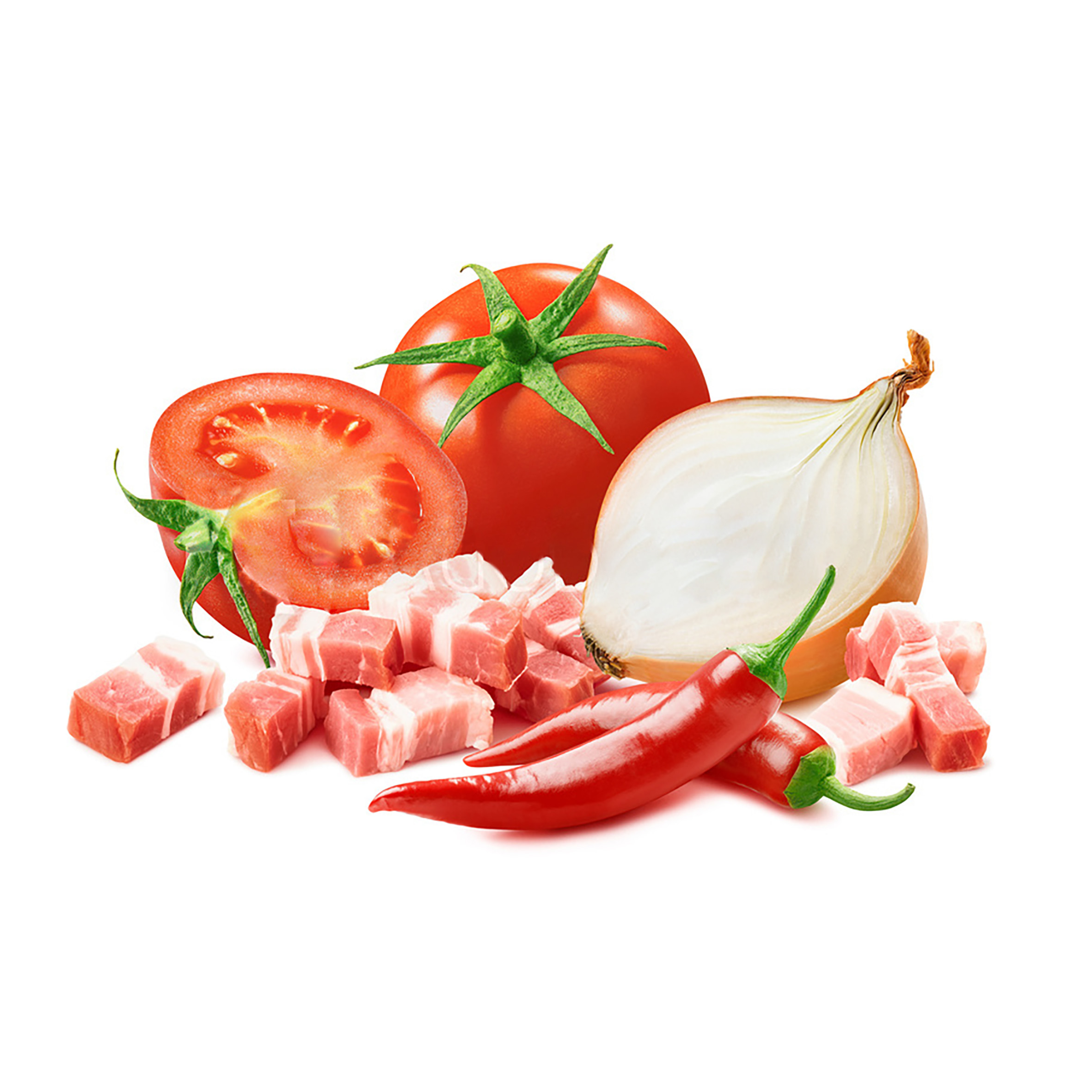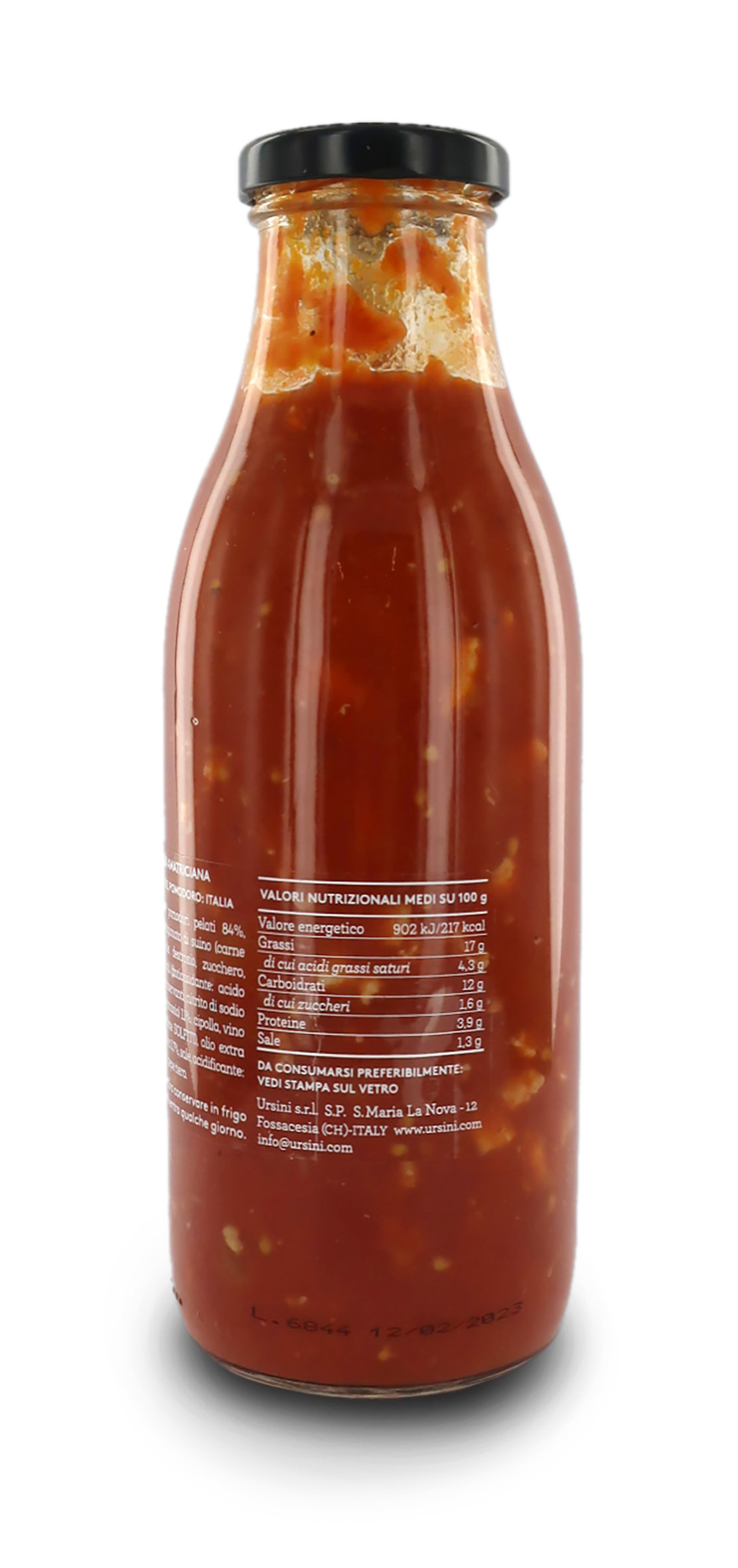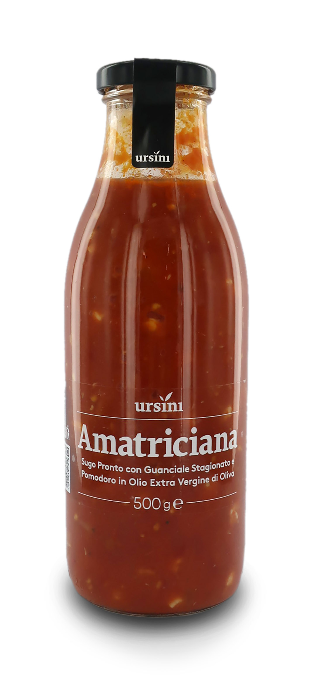 Sugo al gusto classico "amatriciana", pronto da scaldare (in soli 2/3 minuti) e da consumare. Contiene pomodoro pelato e olio extravergine di oliva, ed è insaporito con guanciale stagionato di maiale, cipolla, vino bianco, sale e pepe. Il gusto del pomodoro, unito alla grande sapidità del guanciale stagionato, sono protagonisti in questo sugo, condimento tra i più amati della tradizione culinaria italiana.